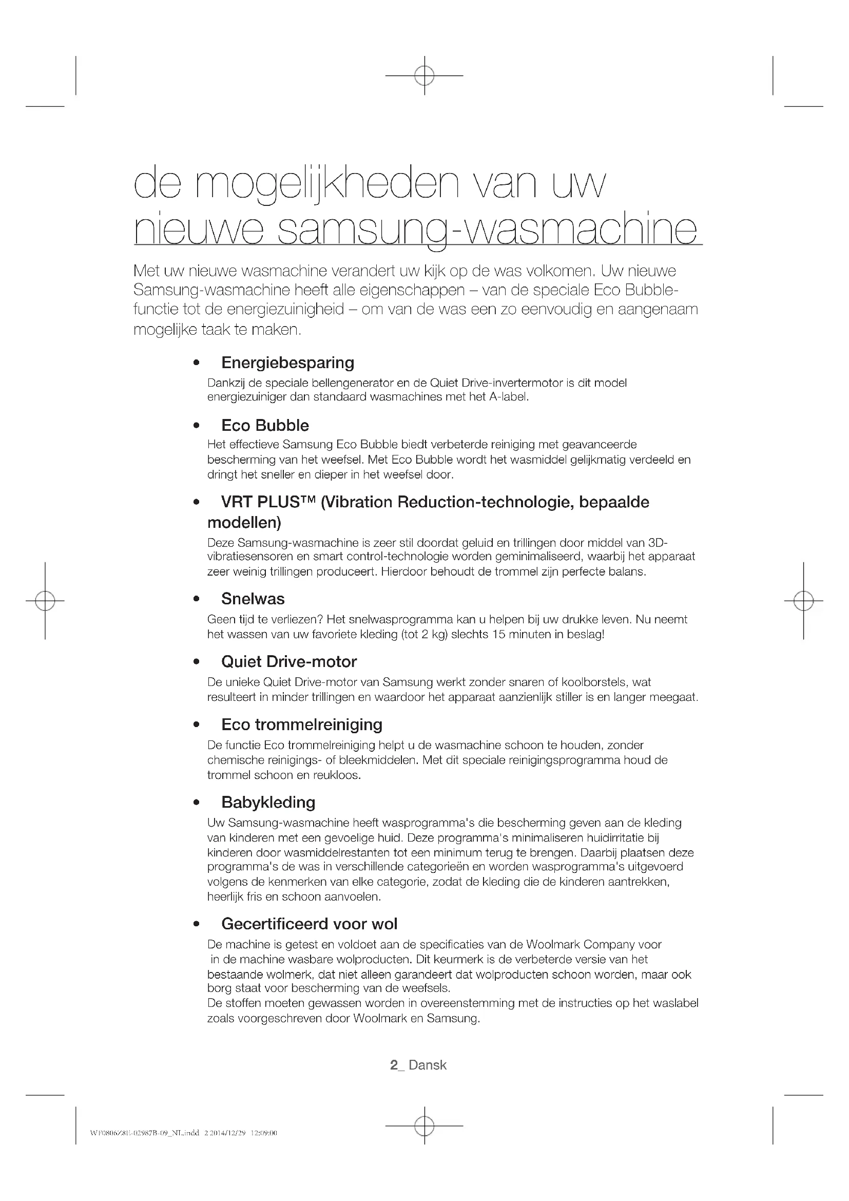 - Gecerticeerdvoorwol De machine is getest en voldoet aan de specificaties van de Woolmark Company voor in de machine wasbare wolproducten. Dit keurmerk is de verbeterde versie van het bestaande wolmerk, dat niet alleen garandeert dat wolproducten schoon worden, maar ook borg staat voor bescherming van de weefsels. De stoffen moeten gewassen worden in overeenstemming met de instructies op het waslabel zoals voorgeschreven door Woolmark en Samsung. WF0806Z8E-02987B-09_NL.indd 2 2014/12/29 12:09:00Dansk _3