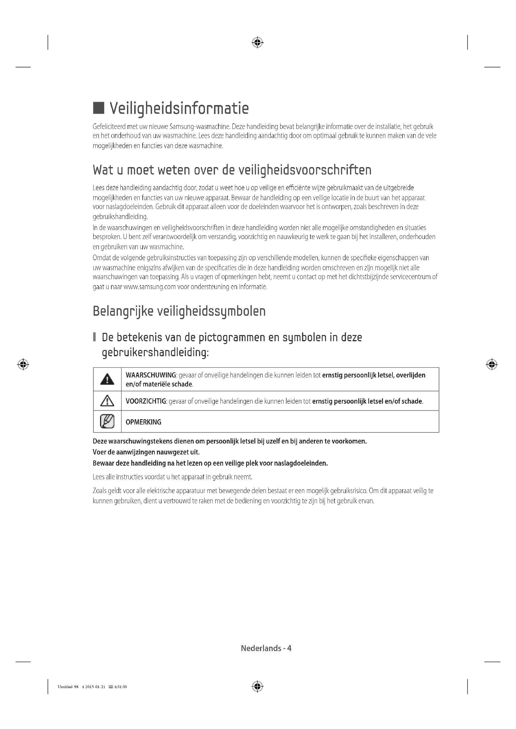- Informatie over hoofdwasprogramma's Untitled-98 3 2015-01-21 4:51:50Nederlands - 4 Veiligheidsinformatie Gefeliciteerd met uw nieuwe Samsung-wasmachine. Deze handleiding bevat belangrijke informatie over de installatie, het gebruik en het onderhoud van uw wasmachine. Lees deze handleiding aandachtig door om optimaal gebruik te kunnen maken van de vele mogelijkheden en functies van deze wasmachine. Wat u moet weten over de veiligheidsvoorschriften Lees deze handleiding aandachtig door, zodat u weet hoe u op veilige en efficiënte wijze gebruikmaakt van de uitgebreide mogelijkheden en functies van uw nieuwe apparaat. Bewaar de handleiding op een veilige locatie in de buurt van het apparaat voor naslagdoeleinden. Gebruik dit apparaat alleen voor de doeleinden waarvoor het is ontworpen, zoals beschreven in deze gebruikshandleiding. In de waarschuwingen en veiligheidsvoorschriften in deze handleiding worden niet alle mogelijke omstandigheden en situaties besproken. U bent zelf verantwoordelijk om verstandig, voorzichtig en nauwkeurig te werk te gaan bij het installeren, onderhouden en gebruiken van uw wasmachine. Omdat de volgende gebruiksinstructies van toepassing zijn op verschillende modellen, kunnen de specifieke eigenschappen van uw wasmachine enigszins afwijken van de specificaties die in deze handleiding worden omschreven en zijn mogelijk niet alle waarschuwingen van toepassing. Als u vragen of opmerkingen hebt, neemt u contact op met het dichtstbijzijnde servicecentrum of gaat u naar www.samsung.com voor ondersteuning en informatie. Belangrijke veiligheidssymbolen De betekenis van de pictogrammen en symbolen in deze gebruikershandleiding: WAARSCHUWING: gevaar of onveilige handelingen die kunnen leiden tot ernstig persoonlijk letsel, overlijden en/of materiële schade. VOORZICHTIG: gevaar of onveilige handelingen die kunnen leiden tot ernstig persoonlijk letsel en/of schade. OPMERKING Deze waarschuwingstekens dienen om persoonlijk letsel bij uzelf en bij anderen te voorkomen. Voer de aanwijzingen nauwgezet uit. Bewaar deze handleiding na het lezen op een veilige plek voor naslagdoeleinden. Lees alle instructies voordat u het apparaat in gebruik neemt. Zoals geldt voor alle elektrische apparatuur met bewegende delen bestaat er een mogelijk gebruiksrisico. Om dit apparaat veilig te kunnen gebruiken, dient u vertrouwd te raken met de bediening en voorzichtig te zijn bij het gebruik ervan. Untitled-98 4 2015-01-21 4:51:50Nederlands - 5 01 VEILIGHEIDSINFORMATIE Belangrijke veiligheidsvoorschriften WAARSCHUWING: om de kans op brand, elektrische schokken of persoonlijk letsel bij het gebruik van het apparaat te verminderen, dient u deze algemene veiligheidsvoorschriften te volgen: Laat kinderen (of huisdieren) nooit op of in de wasmachine spelen. De deur van de wasmachine gaat van binnenuit niet makkelijk open en kinderen kunnen ernstig verwond raken wanneer ze worden opgesloten. Dit apparaat mag niet worden gebruikt door personen (inclusief kinderen) met een verminderd fysiek, zintuiglijk of mentaal vermogen, of met onvoldoende ervaring en kennis, tenzij deze toestemming of instructies met betrekking tot het gebruik van het apparaat hebben gekregen van een persoon die verantwoordelijk is voor hun veiligheid. Kinderen dienen onder toezicht te worden gehouden om te voorkomen dat ze met het apparaat gaan spelen. Voor gebruik in Europa: dit apparaat kan worden gebruikt door kinderen van 8 jaar en ouder en personen met een verminderd fysiek, zintuiglijk of metaal vermogen of met onvoldoende ervaring en kennis, mits zij onder toezicht staan of instructies hebben gekregen met betrekking tot het veilig gebruiken van het apparaat en zij begrijpen wat de eventuele risico's zijn. Kinderen mogen niet met de machine spelen. Reiniging en onderhoud mag niet zonder toezicht door kinderen worden uitgevoerd. Als het snoer beschadigd is, moet het uit veiligheidsoverwegingen worden vervangen door de fabrikant of een onderhoudstechnicus van de fabrikant, of door vergelijkbaar bevoegde personen. Dit apparaat moet zo worden geplaatst dat de stekker, de watertoevoer en de afvoer eenvoudig toegankelijk zijn. Zorg er bij apparaten met ventilatieopeningen aan de onderzijde voor dat deze openingen niet worden geblokkeerd door de vloerbedekking. De nieuwe slangen die bij het apparaat worden geleverd, dienen te worden gebruikt en oude slangen mogen niet worden hergebruikt. VOORZICHTIG: Uit veiligheidsoverwegingen vanwege het onbedoeld resetten van de thermische beveiliging mag dit apparaat niet van stroom worden voorzien door middel van een extern schakelapparaat, zoals een tijdschakelaar, of worden aangesloten op een stroomcircuit dat regelmatig wordt in- en uitgeschakeld. Untitled-98 5 2015-01-21 4:51:50Nederlands - 6 WAARSCHUWING: belangrijke WAARSCHUWINGEN met betrekking tot de installatie De installatie van dit apparaat moet worden uitgevoerd door een gekwalificeerde installateur of servicebedrijf. p. 41