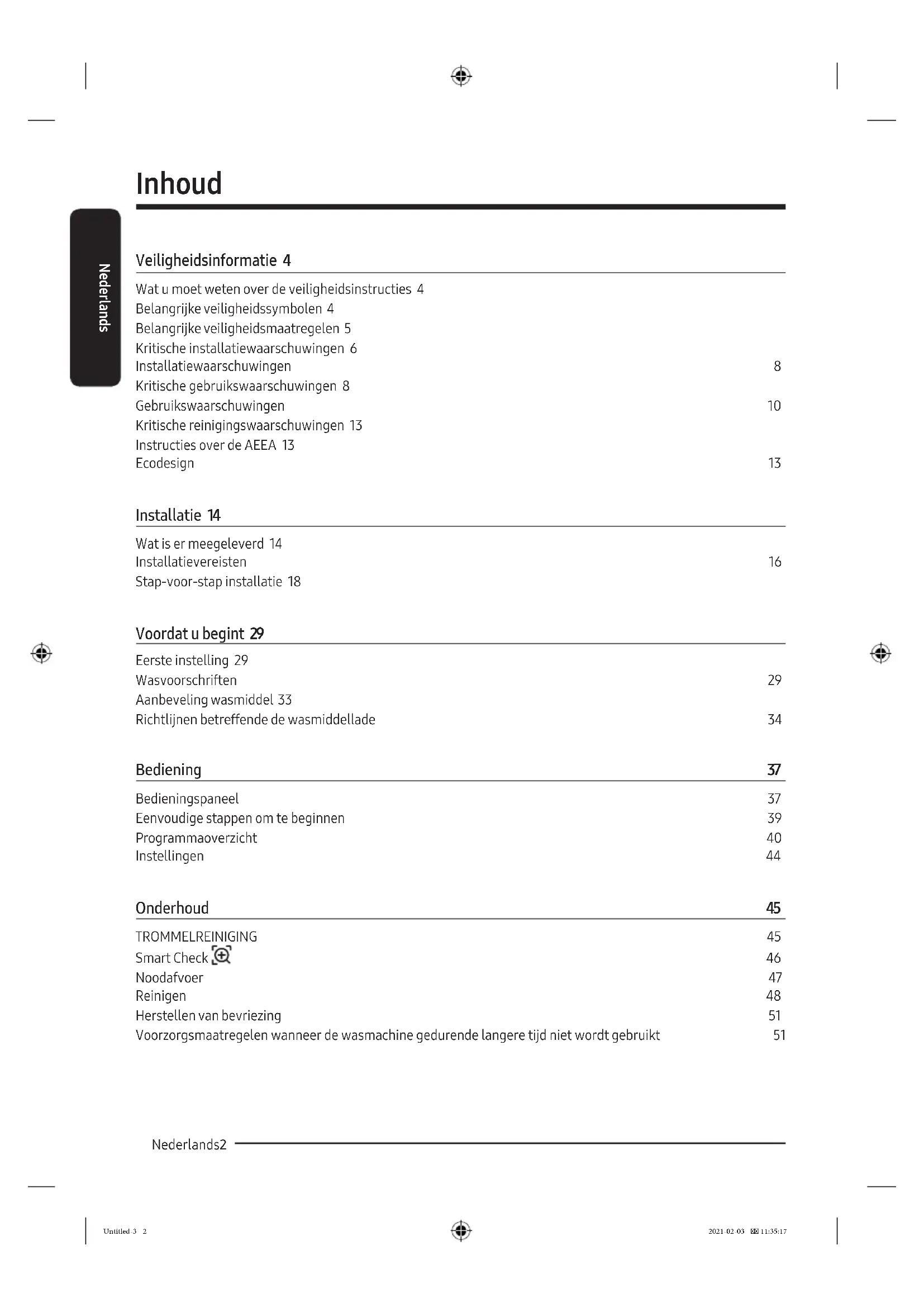 - Als u dit niet doet, kan dit leiden tot elektrische schokken of brand. Instructies over de AEEA Correcte verwijdering van dit product (elektrische & elektronische afvalapparatuur) (Van toepassing in landen waar afval gescheiden wordt ingezameld) Dit merkteken op het product, de accessoires of het informatiemateriaal duidt erop dat het product en zijn elektronische accessoires (bv. lader, headset, USB-kabel) niet met ander huishoudelijk afval verwijderd mogen worden aan het einde van hun gebruiksduur. Om mogelijke schade aan het milieu of de menselijke gezondheid door ongecontroleerde afvalverwijdering te voorkomen, moet u deze artikelen van andere soorten afval scheiden en op een verantwoorde manier recyclen, zodat het duurzame hergebruik van materiaalbronnen wordt bevorderd. Huishoudelijke gebruikers moeten contact opnemen met de winkel waar ze dit product hebben gekocht of met de gemeente waar ze wonen om te vernemen waar en hoe ze deze artikelen milieuvriendelijk kunnen laten recyclen. Zakelijke gebruikers moeten contact opnemen met hun leverancier en de algemene voorwaarden van de koopovereenkomst nalezen. Dit product en zijn elektronische accessoires mogen niet met ander bedrijfsafval voor verwijdering worden gemengd. Ga voor informatie over de milieuverplichtingen van Samsung en productreglementaire verplichtingen, zoals REACH, AEEA of batterijen naar onze duurzaamheidspagina via www.samsung.com Ecodesign Ga voor gedetailleerde instructies over het installeren en reinigen van de wasmachine en ecodesigninformatie (volgens (EU)2019/2023) naar de website van Samsung (http://www.samsung.com), ga naar Support > Support Home en geef de modelnaam op. Untitled-3 13 2021-02-03 11:35:18Nederlands Nederlands14 Installatie Volg deze instructies nauwkeurig op zodat de wasmachine naar behoren wordt geïnstalleerd en ongelukken bij het doen van de was worden voorkomen. Wat is er meegeleverd Controleer of alle onderdelen in de productverpakking aanwezig zijn. Als er een probleem met de wasmachine of de onderdelen is, neemt u contact op met de plaatselijke klantenservice van Samsung of met de verkoper.