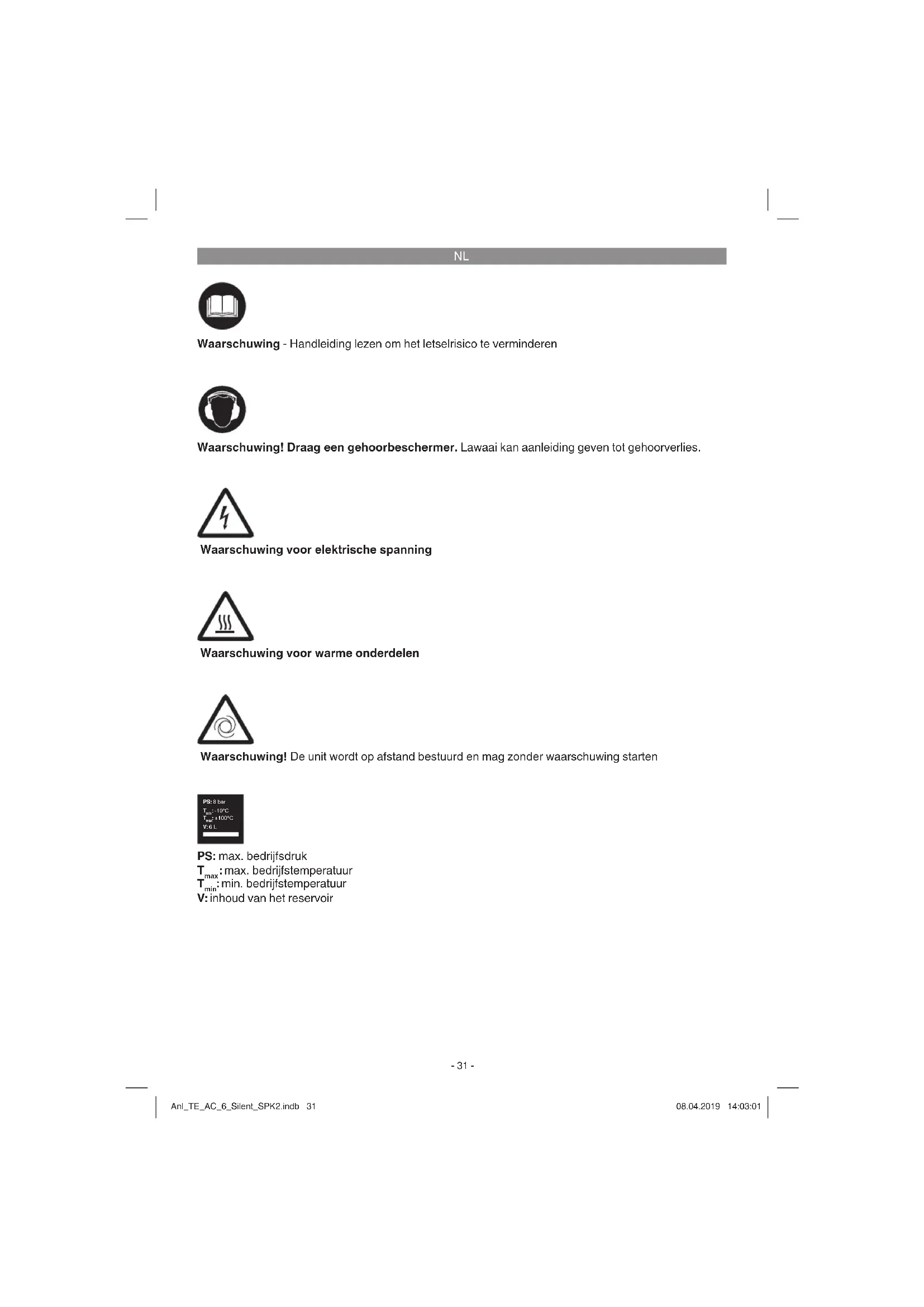 Waarschuwing voor elektrische spanning Waarschuwing voor warme onderdelen Waarschuwing! De unit wordt op afstand bestuurd en mag zonder waarschuwing starten Waarschuwing! Draag een gehoorbeschermer. Lawaai kan aanleiding geven tot gehoorverlies. Waarschuwing - Handleiding lezen om het letselrisico te verminderen PS: max. bedrijfsdruk
