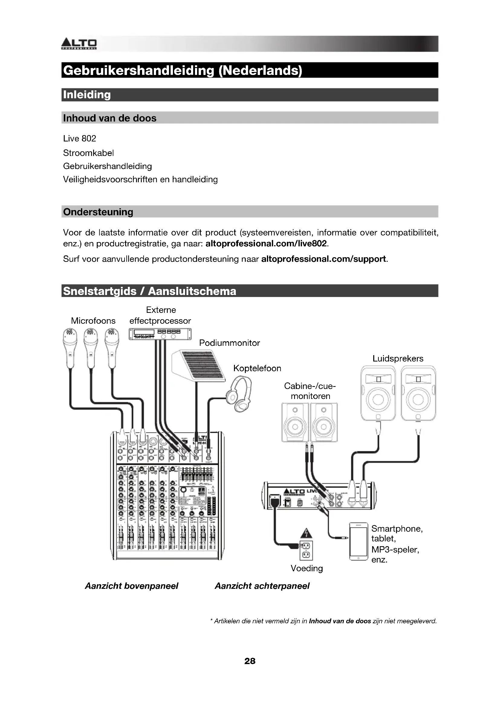Ondersteuning Voor de laatste informatie over dit product (systeemvereisten, informatie over compatibiliteit, enz.) en productregistratie, ga naar: altoprofessional.com/live802. Surf voor aanvullende productondersteuning naar altoprofessional.com/support.