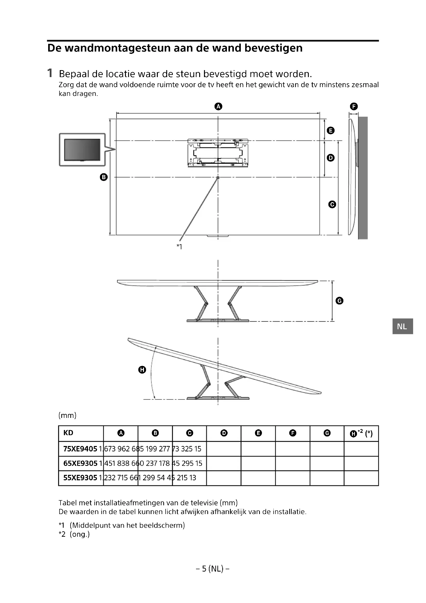 75XE9405 1.673 962 685 199 277 73 325 15 65XE9305 1.451 838 660 237 178 45 295 15 55XE9305 1.232 715 661 299 54 45 215 13 Tabel met installatieafmetingen van de televisie (mm) De waarden in de tabel kunnen licht afwijken afhankelijk van de installatie. *1 (Middelpunt van het beeldscherm) *2 (ong.)− 6 (NL) − Opmerkingen