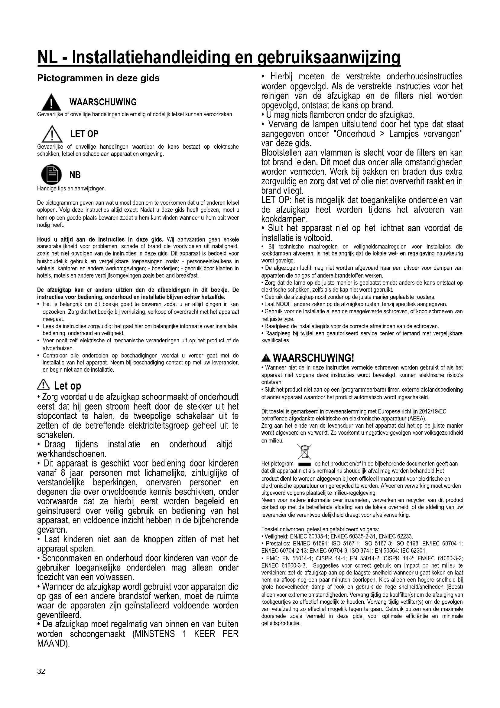 Handige tips en aanwijzingen. De pictogrammen geven aan wat u moet doen om te voorkomen dat u of anderen letsel oplopen. Volg deze instructies altijd exact. Nadat u deze gids heeft gelezen, moet u hem op een goede plaats bewaren zodat u hem kunt vinden wanneer u hem ooit weer nodig heeft. Houd u altijd aan de instructies in deze gids. Wij aanvaarden geen enkele aansprakelijkheid voor problemen, schade of brand die voortvloeien uit nalatigheid, zoals het niet opvolgen van de instructies in deze gids. Dit apparaat is bedoeld voor huishoudelijk gebruik en vergelijkbare toepassingen zoals: - personeelskeukens in winkels, kantoren en andere werkomgevingen; - boerderijen; - gebruik door klanten in hotels, motels en andere verblijfsomgevingen zoals bed and breakfast. De afzuigkap kan er anders uitzien dan de afbeeldingen in dit boekje. De instructies voor bediening, onderhoud en installatie blijven echter hetzelfde.