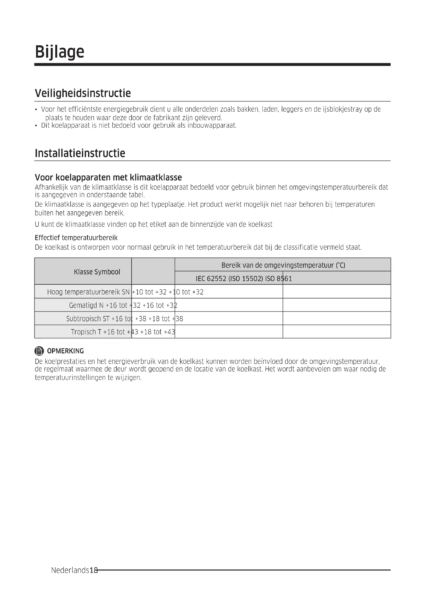 - Dit koelapparaat is niet bedoeld voor gebruik als inbouwapparaat. Installatieinstructie Voor koelapparaten met klimaatklasse Afhankelijk van de klimaatklasse is dit koelapparaat bedoeld voor gebruik binnen het omgevingstemperatuurbereik dat is aangegeven in onderstaande tabel. De klimaatklasse is aangegeven op het typeplaatje. Het product werkt mogelijk niet naar behoren bij temperaturen buiten het aangegeven bereik. U kunt de klimaatklasse vinden op het etiket aan de binnenzijde van de koelkast Effectief temperatuurbereik De koelkast is ontworpen voor normaal gebruik in het temperatuurbereik dat bij de classificatie vermeld staat. Klasse Symbool Bereik van de omgevingstemperatuur (°C)
