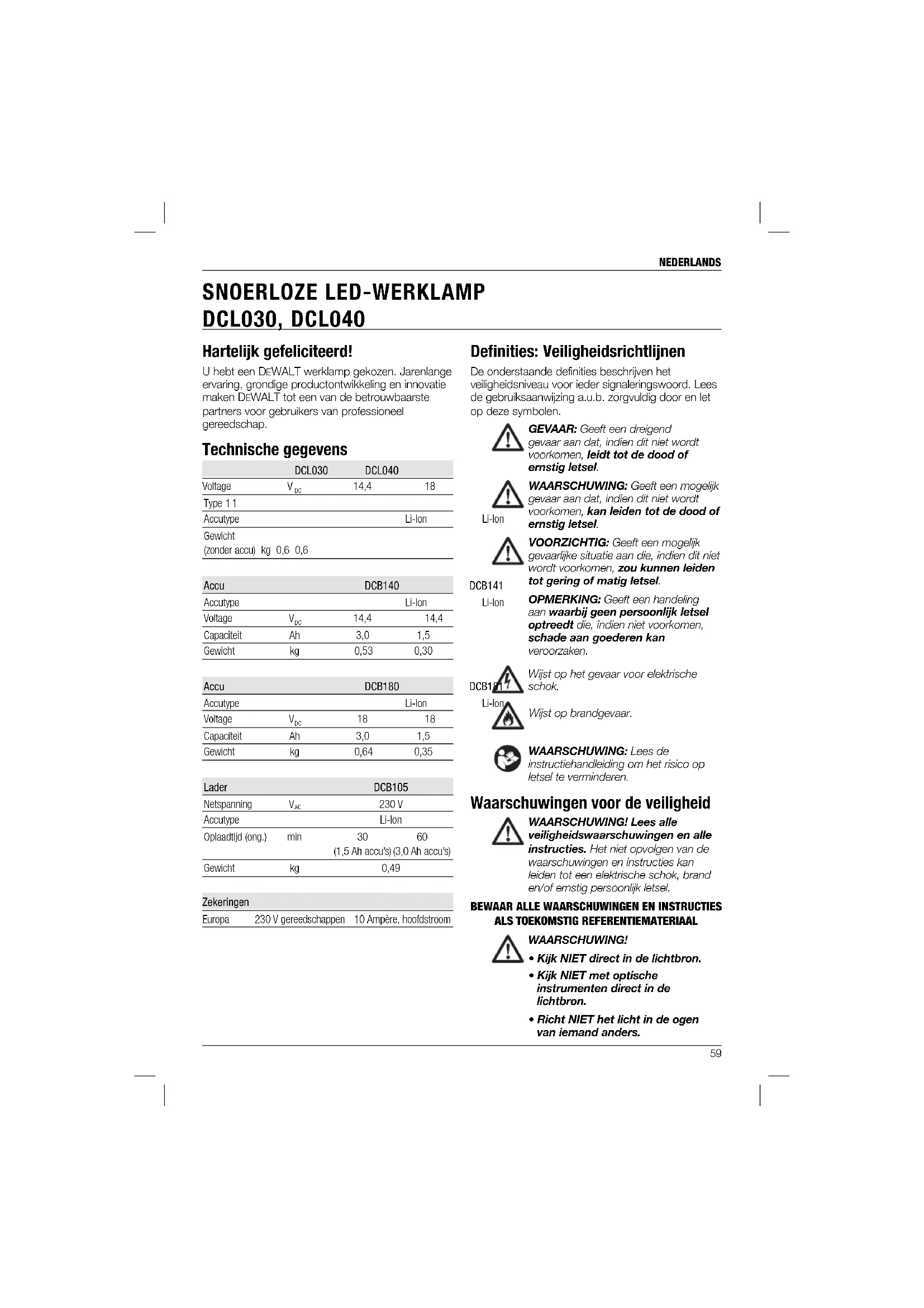 SNOERLOZE LED-WERKLAMP DCL030, DCL040 Hartelijk gefeliciteerd! U hebt een DEWALT werklamp gekozen. Jarenlange ervaring, grondige productontwikkeling en innovatie maken DEWALT tot een van de betrouwbaarste partners voor gebruikers van professioneel gereedschap. Technische gegevens DCL030 DCL040 Voltage V