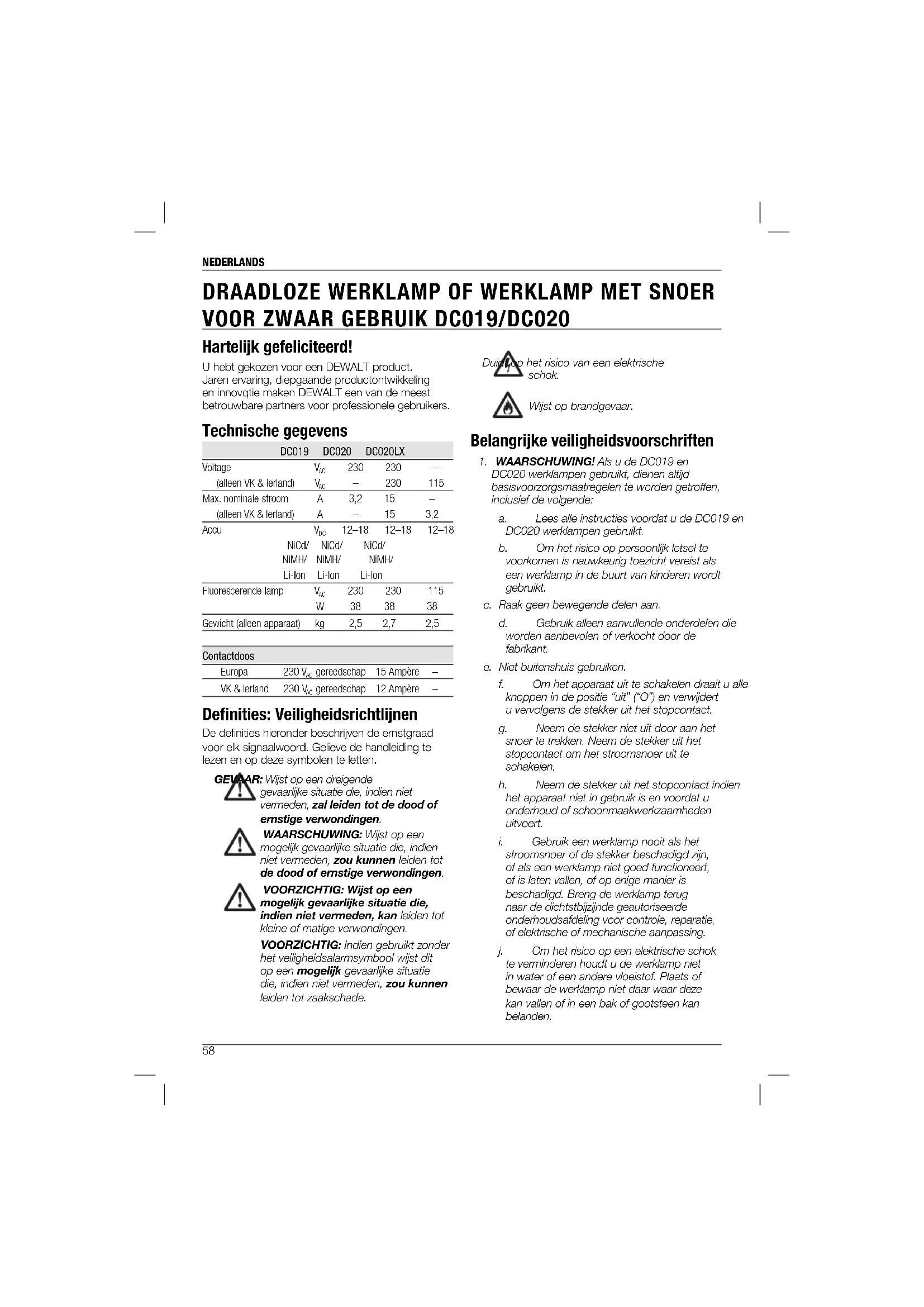 stroomsnoer of de stekker beschadigd zijn, of als een werklamp niet goed functioneert, of is laten vallen, of op enige manier is beschadigd. Breng de werklamp terug naar de dichtstbijzijnde geautoriseerde onderhoudsafdeling voor controle, reparatie, of elektrische of mechanische aanpassing. j. Om het risico op een elektrische schok te verminderen houdt u de werklamp niet in water of een andere vloeistof. Plaats of bewaar de werklamp niet daar waar deze kan vallen of in een bak of gootsteen kan belanden. Hartelijk gefeliciteerd! U hebt gekozen voor een DEWALT product. Jaren ervaring, diepgaande productontwikkeling en innovqtie maken DEWALT een van de meest betrouwbare partners voor professionele gebruikers. Technische gegevens DC019 DC020 DC020LX Voltage V