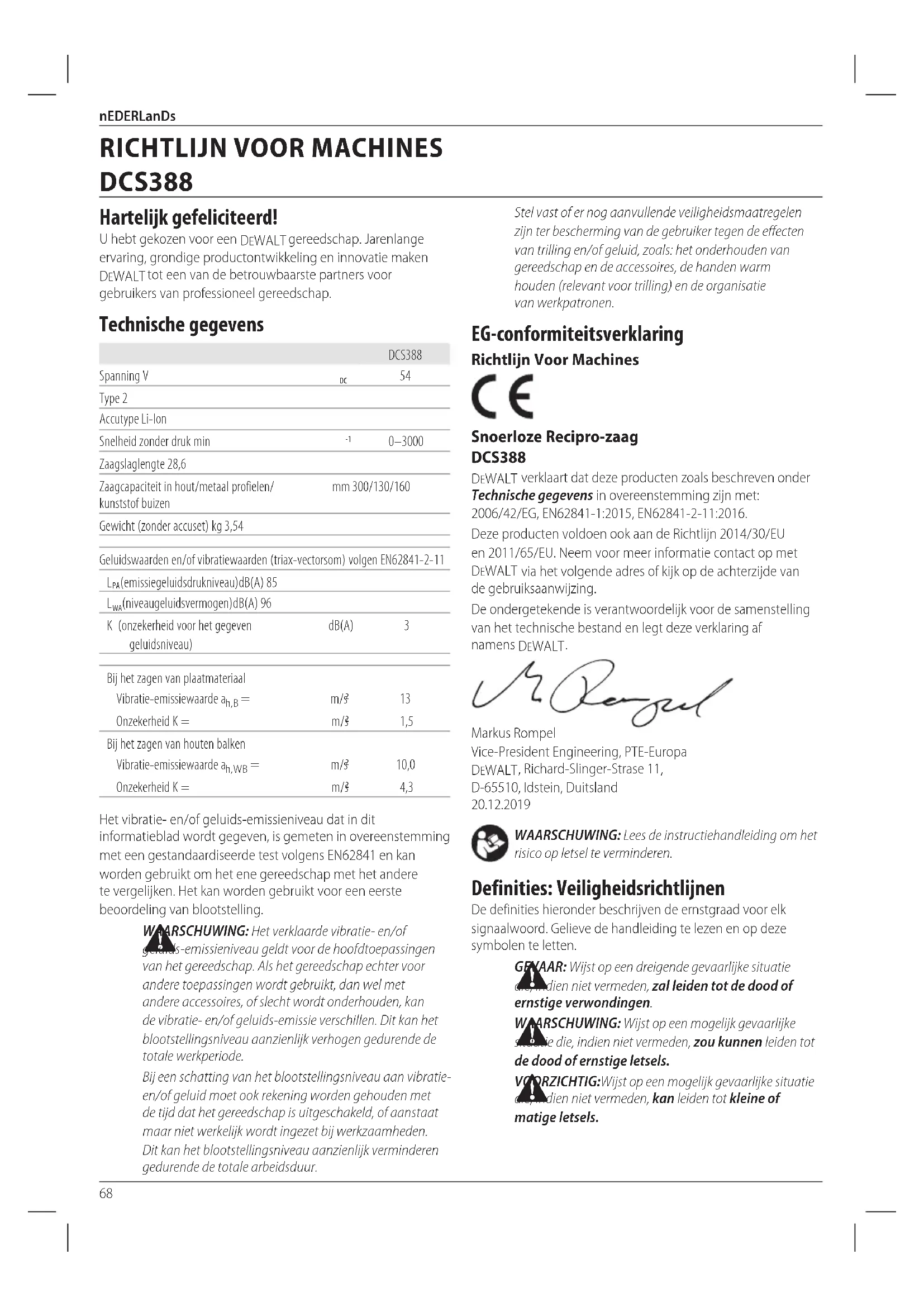 VOORZICHTIG:Wijst op een mogelijk gevaarlijke situatie die, indien niet vermeden, kan leiden tot kleine of matigeletsels. EG-conformiteitsverklaring Richtlijn Voor Machines Snoerloze Recipro-zaag DCS388 DeWALT verklaart dat deze producten zoals beschreven onder Technische gegevens in overeenstemming zijn met: 2006/42/EG, EN62841-1:2015, EN62841-2-11:2016. Deze producten voldoen ook aan de Richtlijn 2014/30/EU en 2011/65/EU. Neem voor meer informatie contact op met DeWALT via het volgende adres of kijk op de achterzijde van degebruiksaanwijzing. De ondergetekende is verantwoordelijk voor de samenstelling van het technische bestand en legt deze verklaring af namens DeWALT