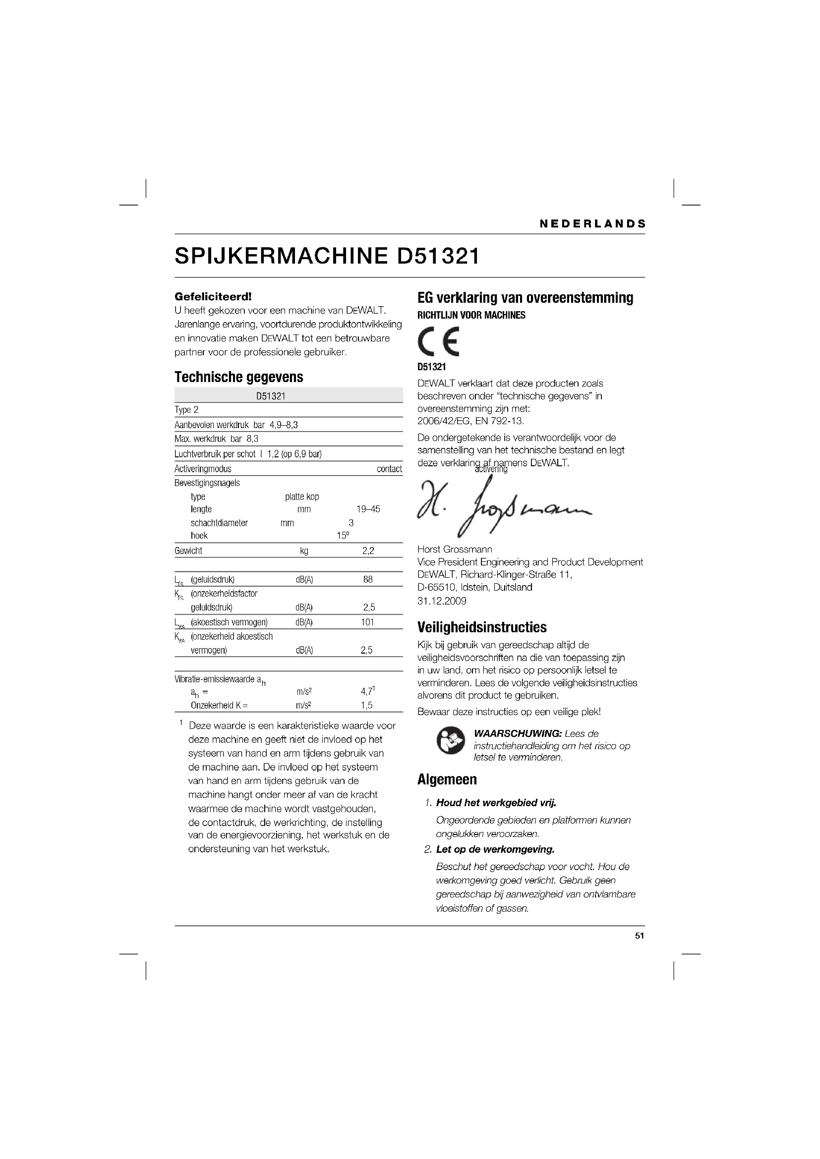 erkend D EWALT herstelagent. Dit gereedschap is in overeenstemming met de veiligheidsvoorschriften van toepassing. Om gevaar te vermijden, mag het gereedschap enkel door erkende techniekers hersteld worden. Aanvullende veiligheidsinstructies voor pneumatisch gereedschap