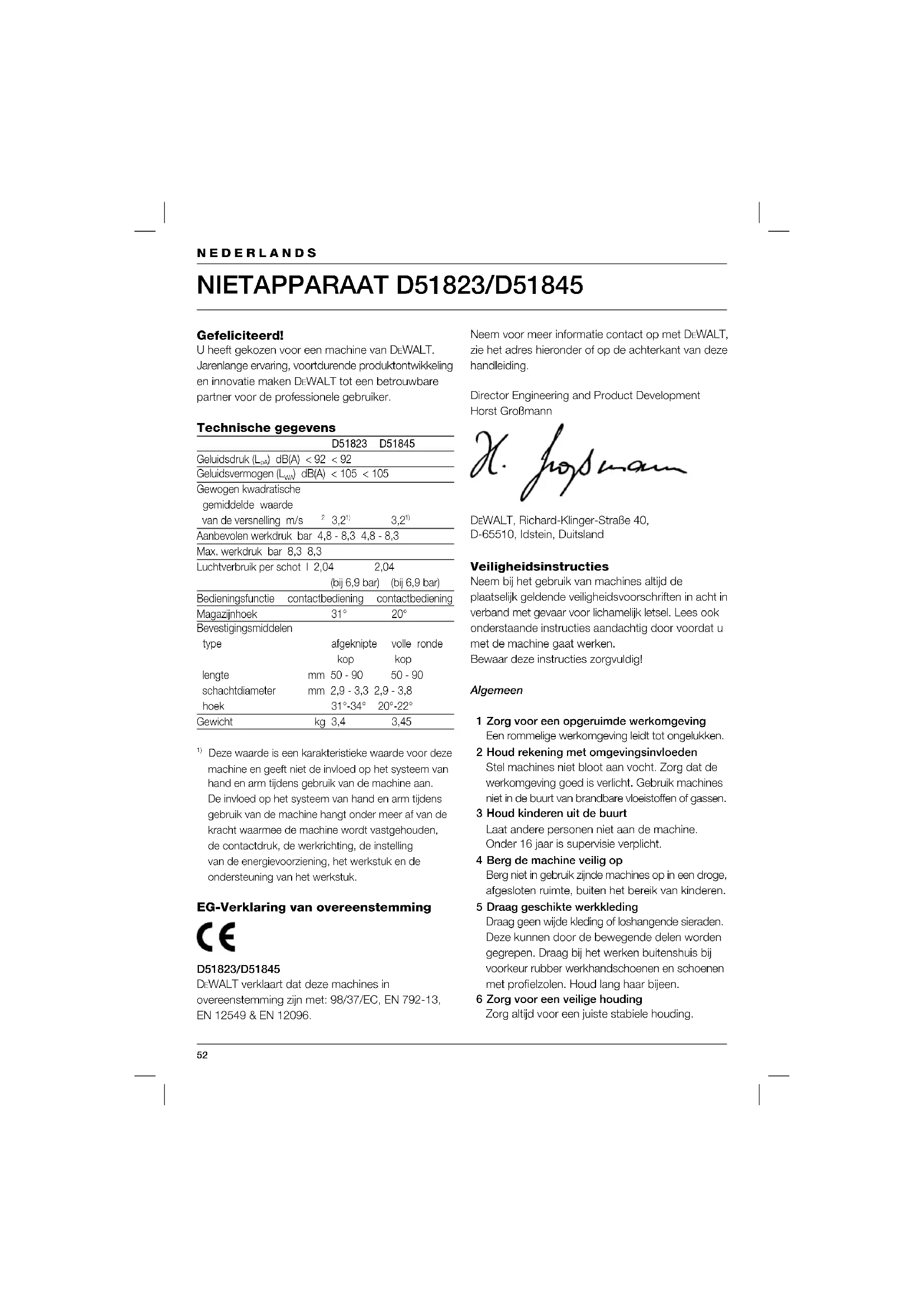 Deze waarde is een karakteristieke waarde voor deze machine en geeft niet de invloed op het systeem van hand en arm tijdens gebruik van de machine aan. De invloed op het systeem van hand en arm tijdens gebruik van de machine hangt onder meer af van de kracht waarmee de machine wordt vastgehouden, de contactdruk, de werkrichting, de instelling van de energievoorziening, het werkstuk en de ondersteuning van het werkstuk. EG-Verklaring van overeenstemming D51823/D51845
