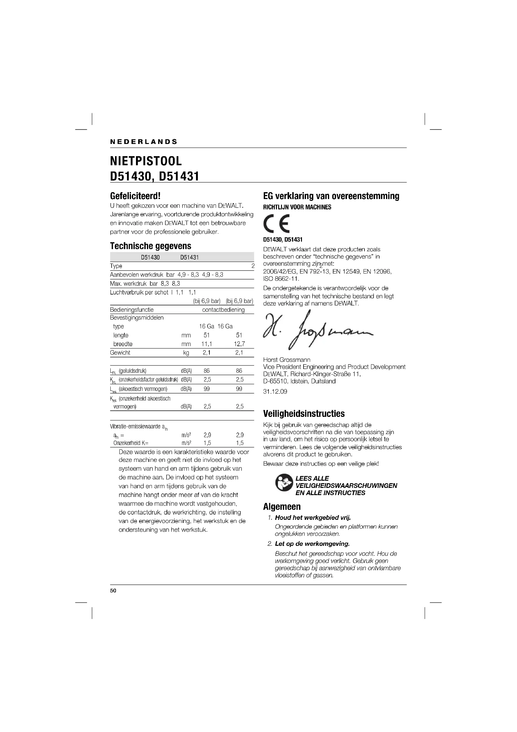 D51430, D51431 DEWALT verklaart dat deze producten zoals beschreven onder “technische gegevens” in overeenstemming zijn met: 2006/42/EG, EN 792-13, EN 12549, EN 12096, ISO 8662-11. De ondergetekende is verantwoordelijk voor de samenstelling van het technische bestand en legt deze verklaring af namens DEWALT. Horst Grossmann Vice President Engineering and Product Development DEWALT, Richard-Klinger-Straße 11, D-65510, Idstein, Duitsland