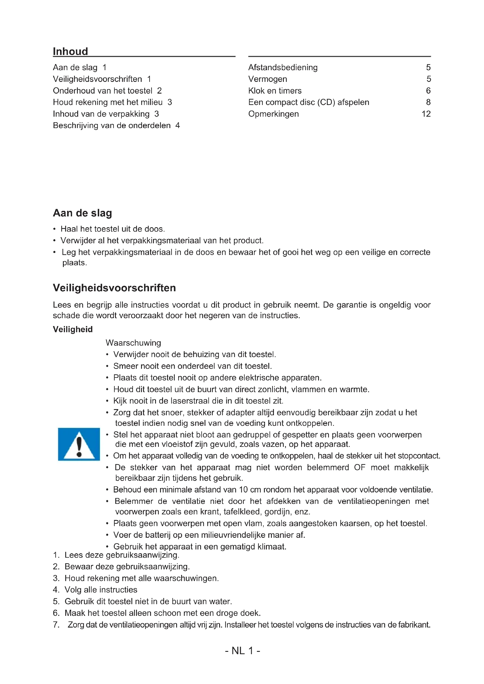 Aan de slag 1 Veiligheidsvoorschriften 1 Onderhoud van het toestel 2 Houd rekening met het milieu 3 Inhoud van de verpakking 3 Beschrijving van de onderdelen 4 Afstandsbediening 5 Vermogen 5 Klok en timers 6 Een compact disc (CD) afspelen 8 Opmerkingen: 12