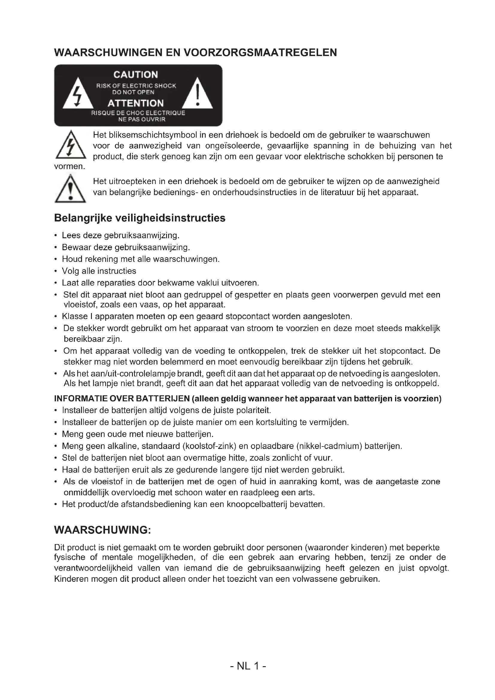 - Het product/de afstandsbediening kan een knoopcelbatterij bevatten. WAARSCHUWING: Dit product is niet gemaakt om te worden gebruikt door personen (waaronder kinderen) met beperkte fysische of mentale mogelijkheden, of die een gebrek aan ervaring hebben, tenzij ze onder de verantwoordelijkheid vallen van iemand die de gebruiksaanwijzing heeft gelezen en juist opvolgt. Kinderen mogen dit product alleen onder het toezicht van een volwassene gebruiken.- NL 2 -
