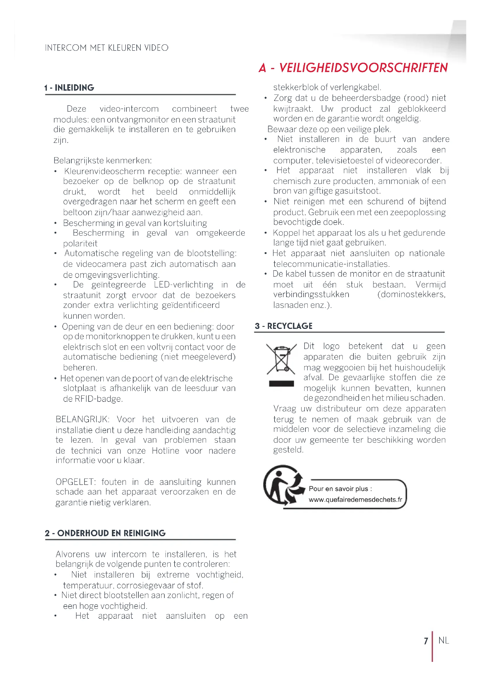 Dit logo betekent dat u geen apparaten die buiten gebruik zijn mag weggooien bij het huishoudelijk afval. De gevaarlijke stoffen die ze mogelijk kunnen bevatten, kunnen de gezondheid en het milieu schaden. Vraag uw distributeur om deze apparaten terug te nemen of maak gebruik van de middelen voor de selectieve inzameling die door uw gemeente ter beschikking worden gesteld. Pour en savoir plus : www.quefairedemesdechets.frINTERCOM MET KLEUREN VIDEO