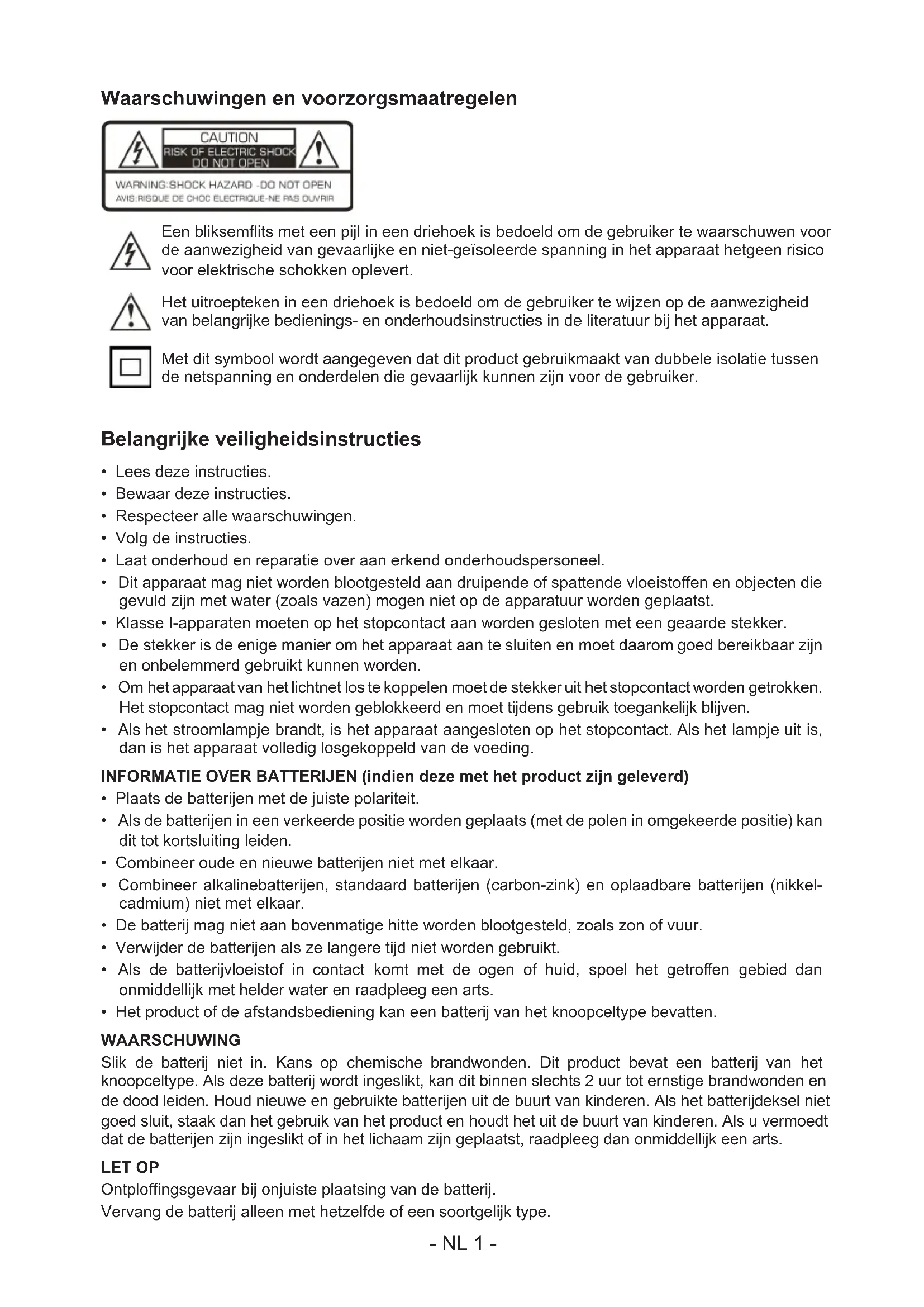 - Verwijder de batterijen als ze langere tijd niet worden gebruikt.