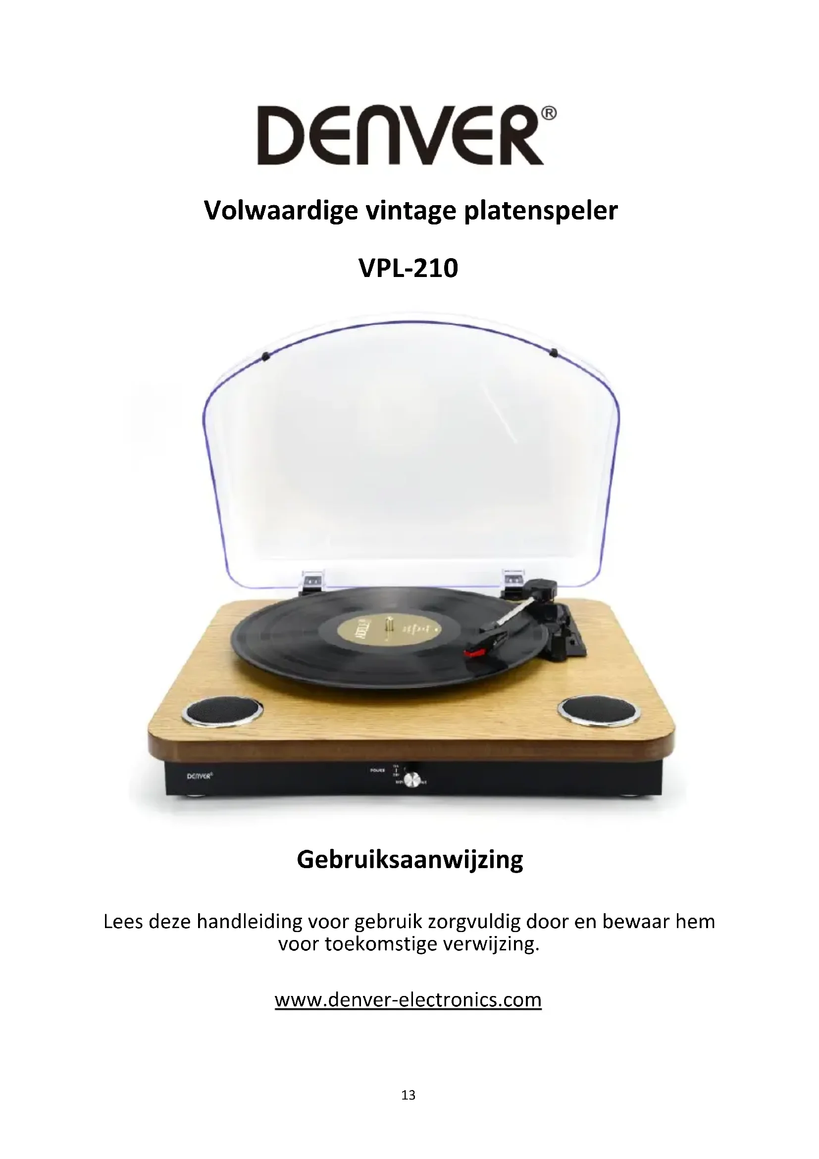 12Volwaardige vintage platenspeler VPL-210 Gebruiksaanwijzing Lees deze handleiding voor gebruik zorgvuldig door en bewaar hem voor toekomstige verwijzing. www.denver-electronics.com