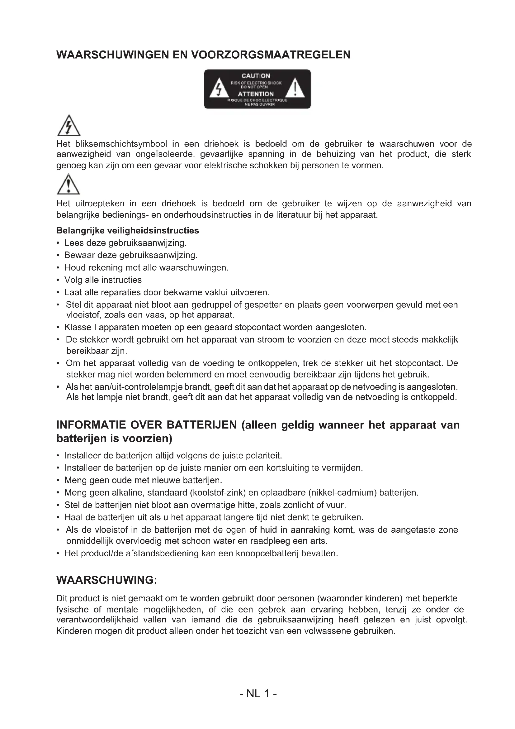 - Het product/de afstandsbediening kan een knoopcelbatterij bevatten. WAARSCHUWING: Dit product is niet gemaakt om te worden gebruikt door personen (waaronder kinderen) met beperkte fysische of mentale mogelijkheden, of die een gebrek aan ervaring hebben, tenzij ze onder de verantwoordelijkheid vallen van iemand die de gebruiksaanwijzing heeft gelezen en juist opvolgt. Kinderen mogen dit product alleen onder het toezicht van een volwassene gebruiken.- NL 2 -