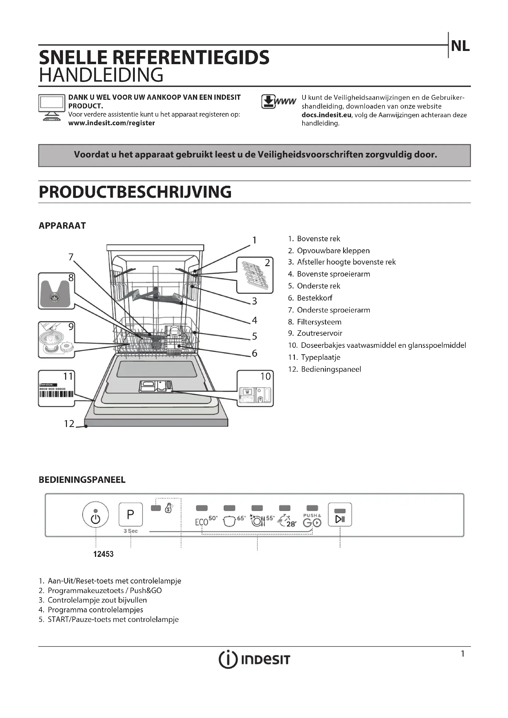Voordat u het apparaat gebruikt leest u de Veiligheidsvoorschriften zorgvuldig door. APPARAAT PRODUCTBESCHRIJVING SNELLE REFERENTIEGIDS HANDLEIDING BEDIENINGSPANEEL DANK U WEL VOOR UW AANKOOP VAN EEN INDESIT PRODUCT. Voor verdere assistentie kunt u het apparaat registeren op:www.indesit.com/register U kunt de Veiligheidsaanwijzingen en de Gebruiker-shandleiding, downloaden van onze website docs.indesit.eu, volg de Aanwijzingen achteraan deze handleiding.1. Bovenste rek2. Opvouwbare kleppen3. Afsteller hoogte bovenste rek4. Bovenste sproeierarm5. Onderste rek6. Bestekkorf7. Onderste sproeierarm8. Filtersysteem9. Zoutreservoir10. Doseerbakjes vaatwasmiddel en glansspoelmiddel11. Typeplaatje12. Bedieningspaneel1. Aan-Uit/Reset-toets met controlelampje2. Programmakeuzetoets / Push&GO3. Controlelampje zout bijvullen4. Programma controlelampjes5. START/Pauze-toets met controlelampje0000 000 00000 Service: