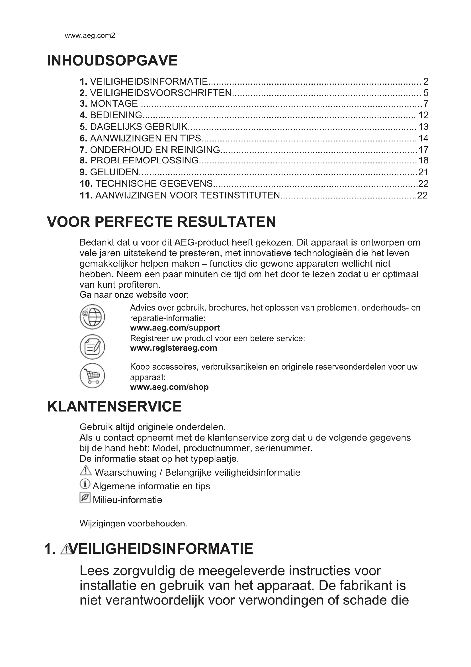 Bedankt dat u voor dit AEG-product heeft gekozen. Dit apparaat is ontworpen om vele jaren uitstekend te presteren, met innovatieve technologieën die het leven gemakkelijker helpen maken – functies die gewone apparaten wellicht niet hebben. Neem een paar minuten de tijd om het door te lezen zodat u er optimaal van kunt profiteren. Ga naar onze website voor: Advies over gebruik, brochures, het oplossen van problemen, onderhouds- en reparatie-informatie: www.aeg.com/support Registreer uw product voor een betere service: www.registeraeg.com Koop accessoires, verbruiksartikelen en originele reserveonderdelen voor uw apparaat: www.aeg.com/shop KLANTENSERVICE Gebruik altijd originele onderdelen. Als u contact opneemt met de klantenservice zorg dat u de volgende gegevens bij de hand hebt: Model, productnummer, serienummer. De informatie staat op het typeplaatje. Waarschuwing / Belangrijke veiligheidsinformatie Algemene informatie en tips Milieu‑informatie Wijzigingen voorbehouden.
