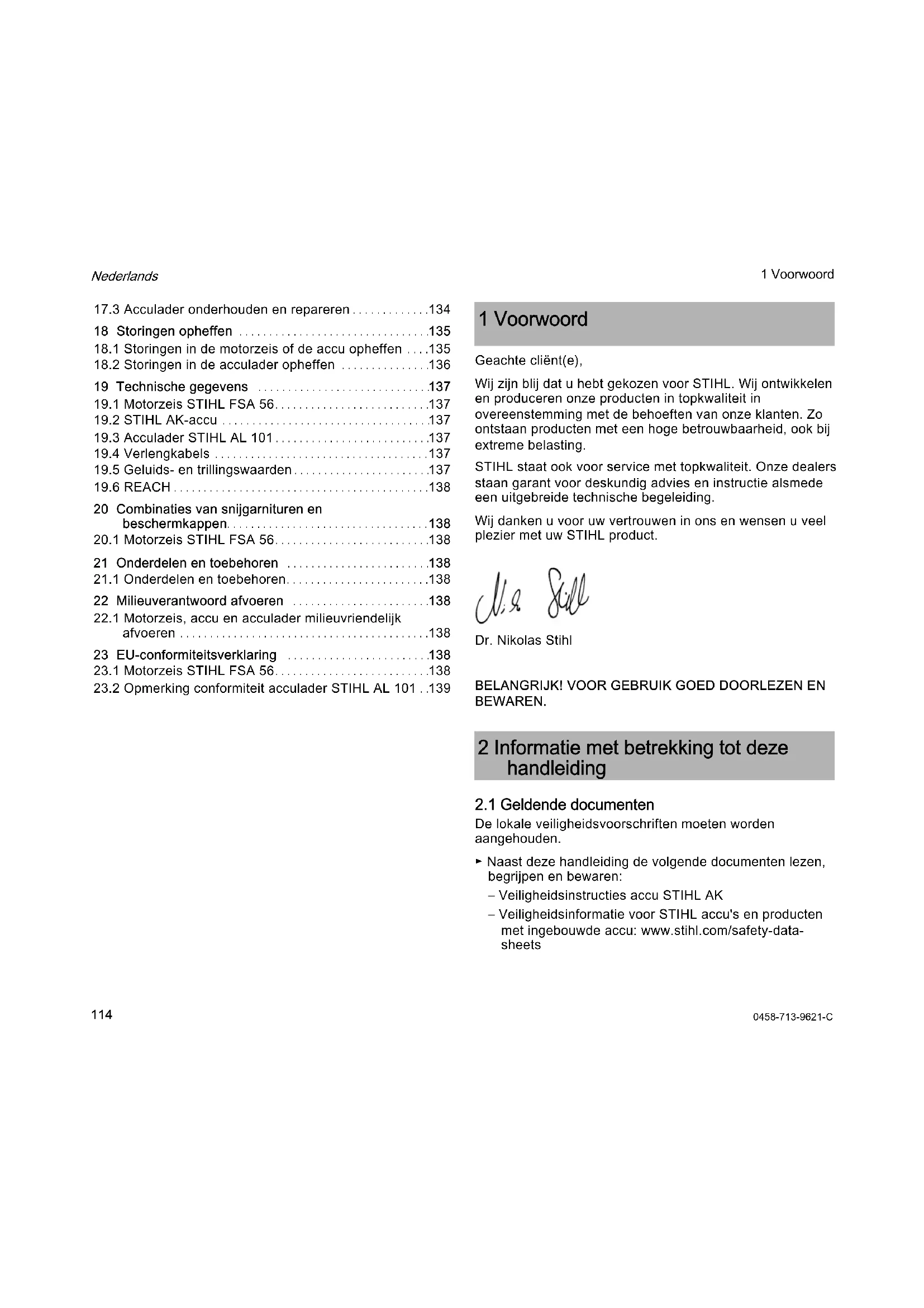 ANDREAS STIHL AG & Co. KG Badstraße 115 D-71336 Waiblingen Duitsland verklaart als enige verantwoordelijke, dat – Type: accumotorzeis – Fabrieksmerk: STIHL –Type: FSA56 – Serie-identificatie: 4522 voldoet aan de betreffende bepalingen van de richtlijnen 2011/65/EU, 2006/42/EG, 2014/30/EU en 2000/14/EG en in overeenstemming met de ten tijde van de productiedatum geldende versies van de volgende normen is ontwikkeld en geproduceerd: EN 55014-1, EN 55014-2, EN 60335-1 en EN ISO 12100 met inachtneming van de norm EN 50636-2-91. Voor het bepalen van het gemeten en het gegarandeerde geluidvermogensniveau werd gehandeld volgens de richtlijn 2000/14/EG, bijlage VIII. 20 Combinaties van snijgarnituren en beschermkappen 21 Onderdelen en toebehoren Deze symbolen kenmerken de originele STIHL onderdelen en het originele STIHL toebehoren. 22 Milieuverantwoord afvoeren 23 EU-conformiteitsverklaring0458-713-9621-C