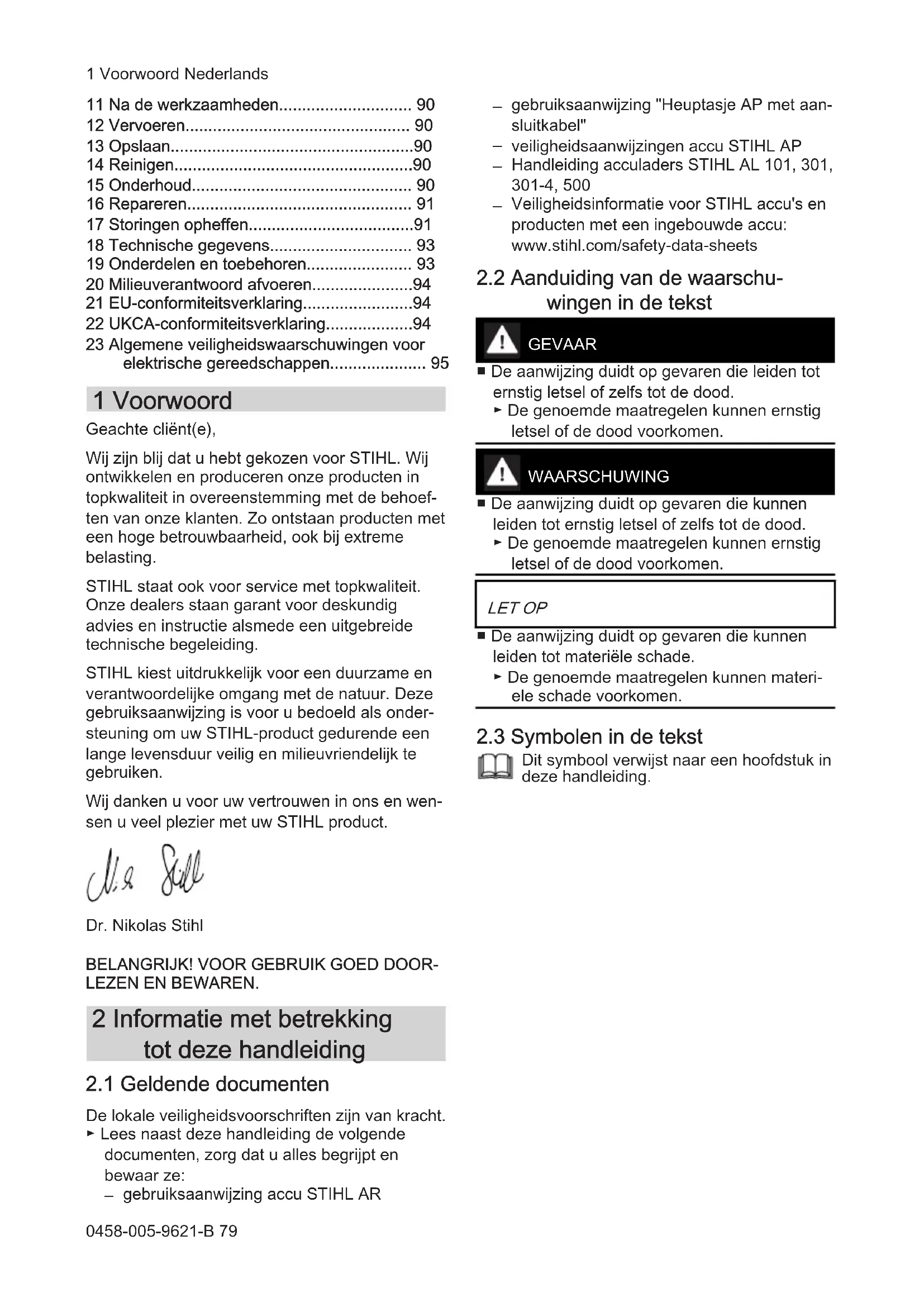 - 23 Algemene veiligheidswaarschuwingen voor elektrische gereedschappen 1 Voorwoord Geachte cliënt(e), Wij zijn blij dat u hebt gekozen voor STIHL. Wij ontwikkelen en produceren onze producten in topkwaliteit in overeenstemming met de behoef‐ ten van onze klanten. Zo ontstaan producten met een hoge betrouwbaarheid, ook bij extreme belasting. STIHL staat ook voor service met topkwaliteit. Onze dealers staan garant voor deskundig advies en instructie alsmede een uitgebreide technische begeleiding. STIHL kiest uitdrukkelijk voor een duurzame en verantwoordelijke omgang met de natuur. Deze gebruiksaanwijzing is voor u bedoeld als onder‐ steuning om uw STIHL-product gedurende een lange levensduur veilig en milieuvriendelijk te gebruiken. Wij danken u voor uw vertrouwen in ons en wen‐ sen u veel plezier met uw STIHL product. Dr. Nikolas Stihl p. 95
