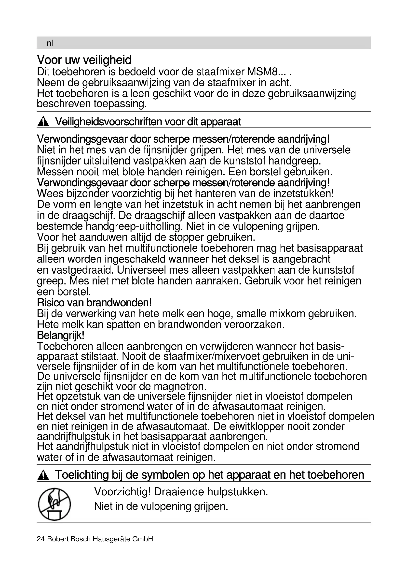 Con riserva di modifiche.24 Robert Bosch Hausgeräte GmbH Voor uw veiligheid Dit toebehoren is bedoeld voor de staafmixer MSM8... . Neem de gebruiksaanwijzing van de staafmixer in acht. Het toebehoren is alleen geschikt voor de in deze gebruiksaanwijzing beschreven toepassing.