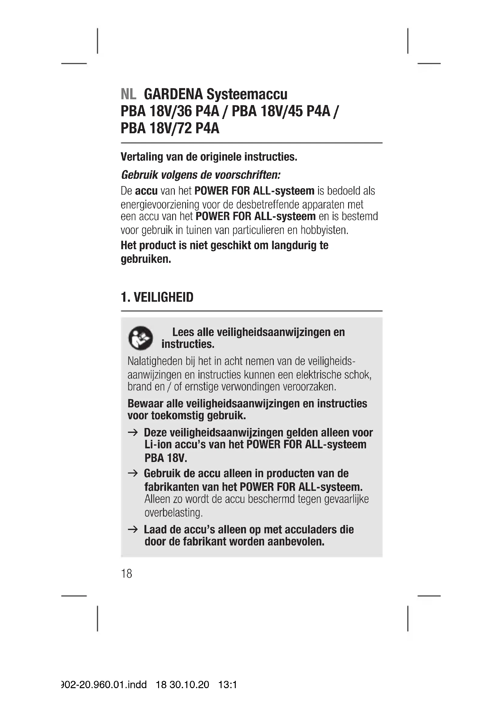 14902-20.960.01.indd 17 30.10.20 13:191. VEILIGHEID Lees alle veiligheidsaanwijzingen en instructies. Nalatigheden bij het in acht nemen van de veiligheids- aanwijzingen en instructies kunnen een elektrische schok, brand en / of ernstige verwondingen veroorzaken. Bewaar alle veiligheidsaanwijzingen en instructies voor toekomstig gebruik. v Deze veiligheidsaanwijzingen gelden alleen voor Li-ion accu’s van het POWER FOR ALL-systeem PBA 18V. v Gebruik de accu alleen in producten van de fabrikanten van het POWER FOR ALL-systeem. Alleen zo wordt de accu beschermd tegen gevaarlijke overbelasting. v Laad de accu’s alleen op met acculaders die door de fabrikant worden aanbevolen. NL GARDENA Systeemaccu PBA 18V/36 P4A / PBA 18V/45 P4A /