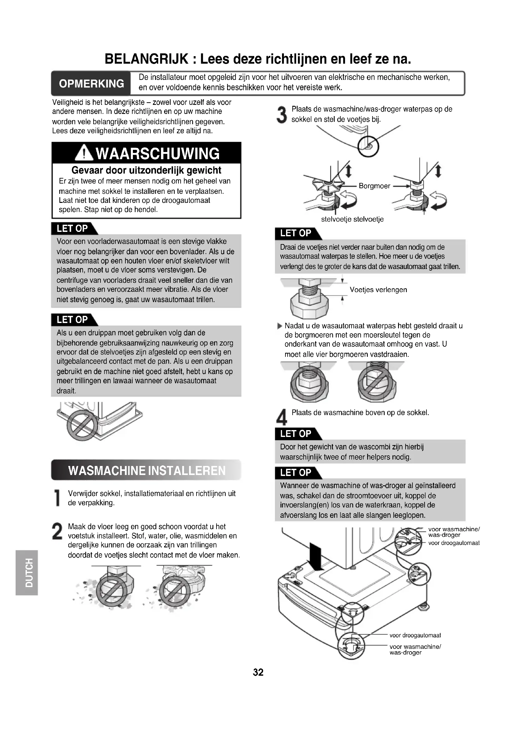 suficiente para conseguir soltar o fixador do tubo de exaustão. Solte o fixador e remova cuidadosamente o tubo de exaustão da respectiva saída na máquina. Porca de fixção Pata de nivelación Pata de nivelación Pata de nivelación Coloque a máquina de secar no local pretendido. O conjunto do aparelho e do pedestal deve ser colocado num piso sólido e direito, para que o aparelho funcione correctamente. Ajuste os pés do aparelho e do pedestal, rodando-os com a ajuda de uma chave de parafusos. Em seguida, ajuste a porca de fixação ao pedestal, segurando o pé do mesmo com uma chave de parafusos. O instalador deverá ter habilitações técnicas e mecânicas e conhecimentos suficientes para o trabalho a efectuar. NOTA A má instalação dos parafusos pode resultar em vibração e ruído. NOTA Clipe em forma de T Dispositivo de retenção. PORTUGAL32 DUTCHvoor wasmachine/was-drogervoor droogautomaatvoor droogautomaatvoor wasmachine/was-drogerBorgmoerstelvoetje stelvoetjeVoetjes verlengen BELANGRIJK : Lees deze richtlijnen en leef ze na. OPMERKING De installateur moet opgeleid zijn voor het uitvoeren van elektrische en mechanische werken,en over voldoende kennis beschikken voor het vereiste werk.Veiligheid is het belangrijkste – zowel voor uzelf als voorandere mensen. In deze richtlijnen en op uw machineworden vele belangrijke veiligheidsrichtlijnen gegeven.Lees deze veiligheidsrichtlijnen en leef ze altijd na.Verwijder sokkel, installatiemateriaal en richtlijnen uitde verpakking.Plaats de wasmachine boven op de sokkel. WAARSCHUWING Gevaar door uitzonderlijk gewicht Er zijn twee of meer mensen nodig om het geheel vanmachine met sokkel te installeren en te verplaatsen.Laat niet toe dat kinderen op de droogautomaatspelen. Stap niet op de hendel.Voor een voorladerwasautomaat is een stevige vlakkevloer nog belangrijker dan voor een bovenlader. Als u dewasautomaat op een houten vloer en/of skeletvloer wiltplaatsen, moet u de vloer soms verstevigen. Decentrifuge van voorladers draait veel sneller dan die vanbovenladers en veroorzaakt meer vibratie. Als de vloerniet stevig genoeg is, gaat uw wasautomaat trillen. WASMACHINE INSTALLEREN Maak de vloer leeg en goed schoon voordat u hetvoetstuk installeert. Stof, water, olie, wasmiddelen endergelijke kunnen de oorzaak zijn van trillingendoordat de voetjes slecht contact met de vloer maken.Nadat u de wasautomaat waterpas hebt gesteld draait ude borgmoeren met een moersleutel tegen deonderkant van de wasautomaat omhoog en vast. Umoet alle vier borgmoeren vastdraaien. Plaats de wasmachine/was-droger waterpas op desokkel en stel de voetjes bij.LET OPAls u een druippan moet gebruiken volg dan debijbehorende gebruiksaanwijzing nauwkeurig op en zorgervoor dat de stelvoetjes zijn afgesteld op een stevig enuitgebalanceerd contact met de pan. Als u een druippangebruikt en de machine niet goed afstelt, hebt u kans opmeer trillingen en lawaai wanneer de wasautomaatdraait.LET OPDraai de voetjes niet verder naar buiten dan nodig om dewasautomaat waterpas te stellen. Hoe meer u de voetjesverlengt des te groter de kans dat de wasautomaat gaat trillen.LET OPDoor het gewicht van de wascombi zijn hierbijwaarschijnlijk twee of meer helpers nodig.LET OPWanneer de wasmachine of was-droger al geïnstalleerdwas, schakel dan de stroomtoevoer uit, koppel deinvoerslang(en) los van de waterkraan, koppel deafvoerslang los en laat alle slangen leeglopen.LET OP33 DUTCH De gaten in het voetstuk moeten in het verlengde liggen van de schroefgaten onderaan de wasautomaat. Vervolgens bevestigt u vier schroeven op de vier hoekpunten om deze stevig aan het voetstuk te bevestigen. Plaats de wasmachine/was-droger waterpas op de sokkel en stel de voetjes bij. Borgmoer stelvoetje stelvoetje Verplaats de wasmachine/was-droger naar de gewenste plaats. Overdwars controleren Wanneer u bovenop de wasautomaat op de hoeken drukt, mag uw machine absoluut niet wiebelen. (Probeer dit in beide richtingen.) Stel de voetjes opnieuw in als de wasautomaat wiebelt wanneer u overdwars op de bovenkant drukt. LET OP Om zeker te weten dat de wasautomaat perfect waterpas staat, schakelt u de wasautomaat in met een testlading wasgoed. Doe ongeveer 3 kg wasgoed in de machine. Druk dan op POWER (Aan), vervolgens op RINSE + SPIN (Spoelen en centrifugeren) en druk daarna de START/PAUZE-knop in. Zie de volgende hoofdstukken voor extra informatie over het kiezen en inschakelen van een wascyclus. De wasautomaat mag tijdens het centrifugeren niet erg schommelen of trillen. Als de wasautomaat trilt of rammelt, stel de instelvoetjes dan bij tot de machine stabiel staat en herhaal de test. LET OP Schroeven die niet goed vast zitten kunnen de oorzaak zijn van van lawaai en trillingen. LET OP Voor een goede werking dient het geheel van machine en sokkel op een stevige horizontale vloer te worden geplaatst. Stel de voetjes van machine en sokkel bij met een sleutel. Draai daarna de borgmoer aan naar de sokkel toe terwijl u de sokkelvoetjes stevig vasthoudt met een sleutel. LET OP Borgmoer stelvoetje stelvoetje34 DUTCH Omwille van het gewicht van de wasmachine zijn hiervoor twee of meer mensen nodig. LET OP Verwijder sokkel, installatiemateriaal en richtlijnen uit de verpakking. De gaten in het voetstuk moeten in het verlengde liggen van de schroefgaten onderaan de wasautomaat. Vervolgens bevestigt u vier schroeven op de twee hoekpunten om deze stevig aan het voetstuk te bevestigen. WAS-DROGER INSTALLEREN Plaats de was-droger boven op de sokkel. Steek de T-klem van de vier borgstukjes in de onderkant van de droger zoals u op de afbeelding kunt zien. Druk de achterkant van de klem omhoog en trek hem naar buiten om hem op zijn plaats vast te zetten. voor droogautomaat voor wasmachine/ was-droger voor wasmachine/ was-droger voor droogautomaat Plaats de wasmachine/was-droger boven op de sokkel. LET OP OPMERKING: Omwille van het gewicht van de wasmachine/was-droger zijn hiervoor twee of meer mensen nodig. OPMERKING: Wanneer d