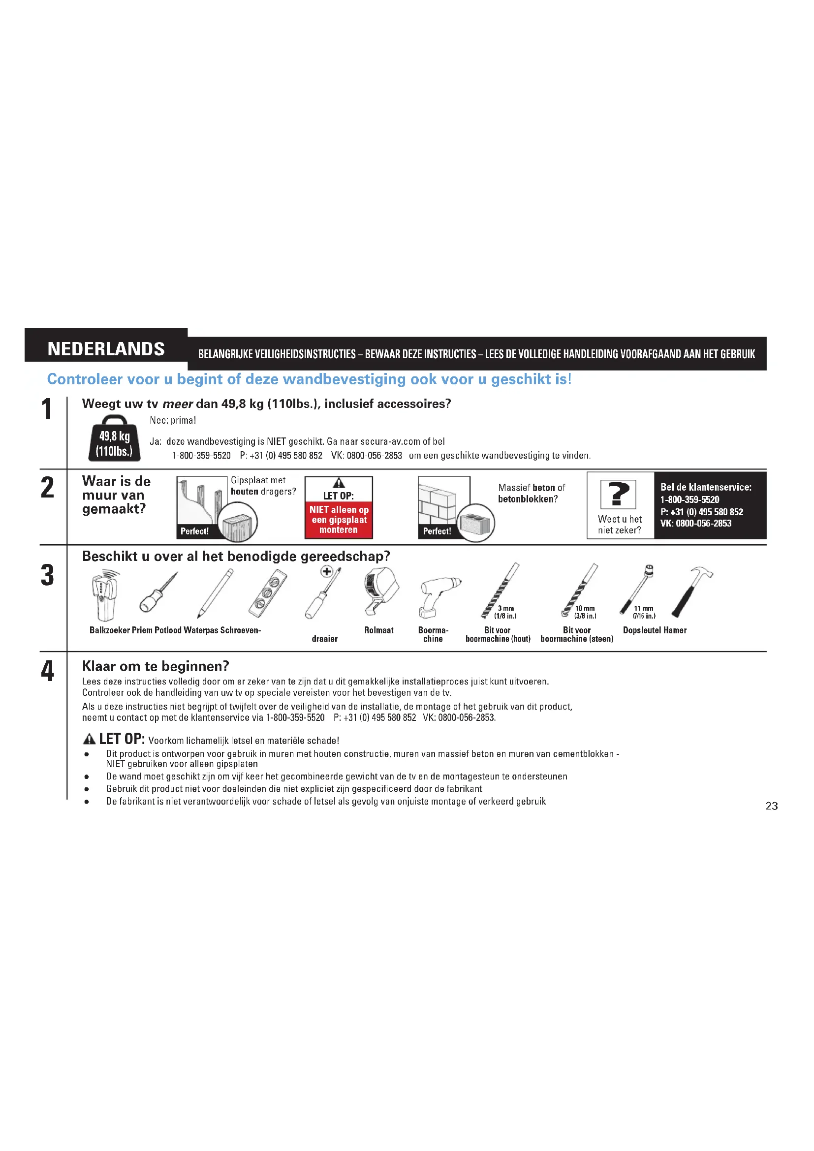 Waar is de muur van gemaakt? Beschikt u over al het benodigde gereedschap? Gipsplaat met houten dragers?Perfect! BELANGRIJKE VEILIGHEIDSINSTRUCTIES – BEWAAR DEZE INSTRUCTIES – LEES DE VOLLEDIGE HANDLEIDING VOORAFGAAND AAN HET GEBRUIK LET OP: NIET alleen op een gipsplaat monterenBalkzoeker Priem Potlood Waterpas Schroeven-draaierRolmaat Boorma-chineBit voor boormachine (hout)Bit voor boormachine (steen)Dopsleutel Hamer11 mm