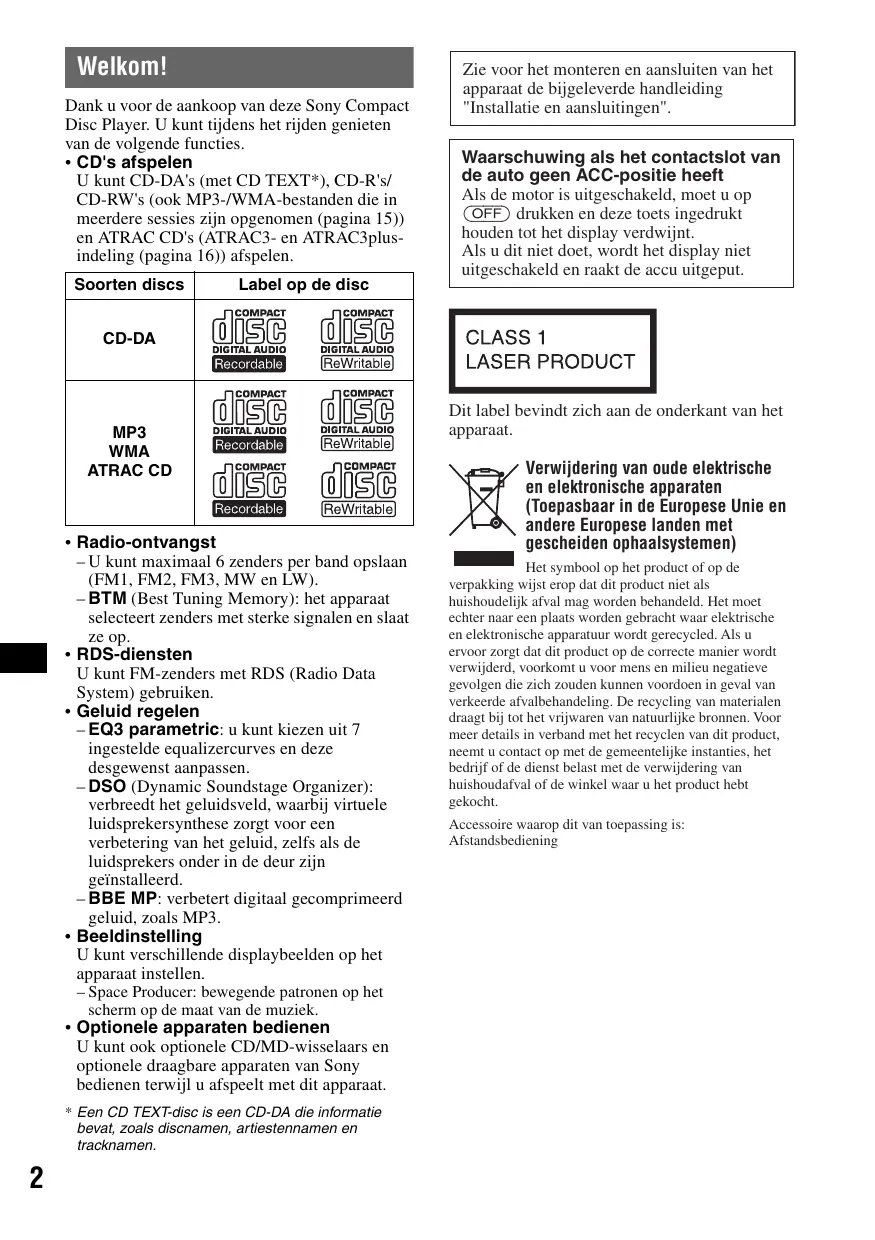 Welkom! Dank u voor de aankoop van deze Sony Compact Disc Player. U kunt tijdens het rijden genieten van de volgende functies.
