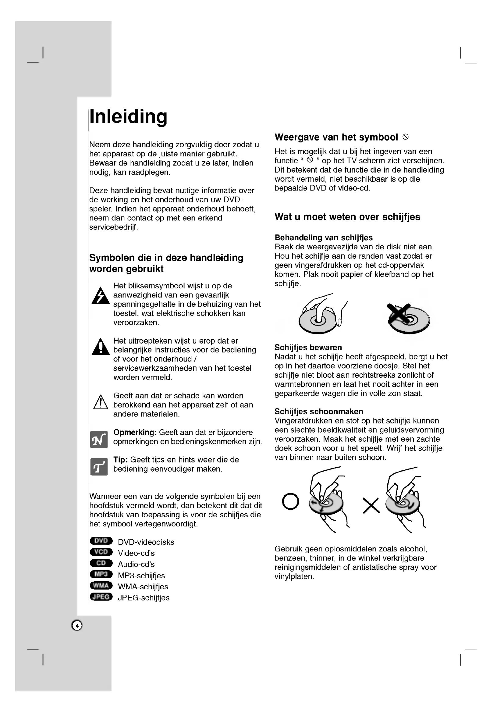 - Technischespecificaties Neemdeze handleiding zorgvuldig doorzodatuhet apparaat opde juiste manier gebruikt. Bewaarde handleiding zodatuzelater,indien nodig, kan raadplegen. Deze handleiding bevat nuttige informatieoverde werking enhetonderhoudvanuwDVD- speler. Indienhet apparaat onderhoudbehoeft,neemdancontactopmeteenerkend servicebedrijf. Symbolen die deze handleiding worden gebruikt Het bliksemsymbool wijst uopde aanwezigheid vaneen gevaarlijk spanningsgehalte inde behuizing vanhettoestel,watelektrischeschokkenkanveroorzaken.Het uitroepteken wijst ueropdater belangrijke instructiesvoorde bediening ofvoorhetonderhoud/servicewerkzaamhedenvanhettoestelwordenvermeld.Geeftaandaterschadekanwordenberokkendaanhet apparaat zelfofaananderematerialen. Opmerking: Geeftaandater bijzondere opmerkingen bedieningskenmerken zijn. Tip: Geeft tips enhintsweerdiede bediening eenvoudiger maken.Wanneereenvande volgende symbolen bij eenhoofdstukvermeldwordt,danbetekentditdatdithoofdstukvan toepassing isvoorde schijfjes diehet symbool vertegenwoordigt. DVD-videodisksVideo-cd'sAudio-cd's MP3-schijfjes WMA-schijfjes JPEG-schijfjes Weergave van het symbool Hetis mogelijk datu bij het ingeven vaneenfunctie ophetTV-schermziet verschijnen. Ditbetekentdatdefunctiedieinde handleiding wordtvermeld,nietbeschikbaarisopdie bepaalde DVDofvideo-cd. Wat moet weten over schijfjes Behandeling van schijfjes Raakde weergavezijde vandedisknietaan.Houhet schijfje aanderandenvastzodatergeen vingerafdrukken ophet cd-oppervlak komen.Plaknooit papier ofkleefbandophet schijfje. Schijfjes bewarenNadatuhet schijfje heeft afgespeeld, bergt uhetopinhetdaartoevoorziene doosje. Stelhet schijfje nietblootaanrechtstreekszonlichtofwarmtebronnenenlaathetnooitachterineen geparkeerde wagendieinvollezonstaat. Schijfjes schoonmaken Vingerafdrukken enstofophet schijfje kunneneenslechtebeeldkwaliteiten geluidsvervorming veroorzaken.Maakhet schijfje meteenzachtedoekschoonvooruhet speelt. Wrijf het schijfje vanbinnennaarbuitenschoon.Gebruikgeen oplosmiddelen zoalsalcohol,benzeen,thinner,indewinkel verkrijgbare reinigingsmiddelen ofantistatischesprayvoor vinylplaten. JPEG WMA MP3 p. 284