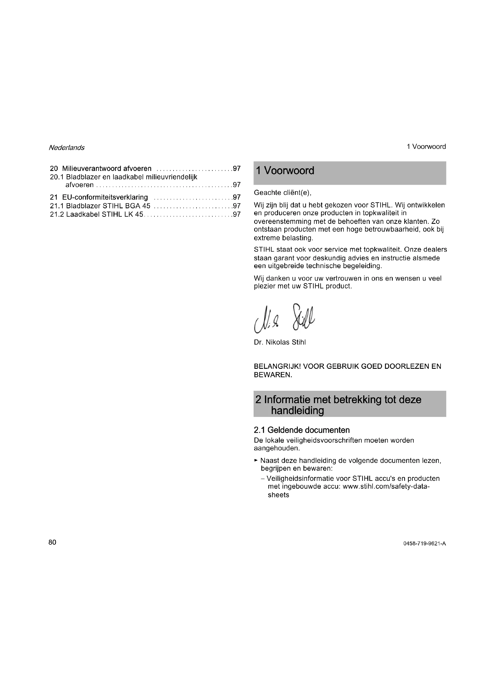 Nederlands 1 Voorwoord Geachte cliënt(e), Wij zijn blij dat u hebt gekozen voorSTIHL. Wij ontwikkelen en produceren onze producten in topkwaliteit in overeenstemming met de behoeften van onze klanten. Zo ontstaan producten met een hoge betrouwbaarheid, ook bij extreme belasting. STIHL staat ook voor service met topkwaliteit. Onze dealers staan garant voor deskundig advies en instructie alsmede een uitgebreide technische begeleiding. Wij danken u voor uw vertrouwen in ons en wensen u veel plezier met uw STIHLproduct. Dr. Nikolas Stihl