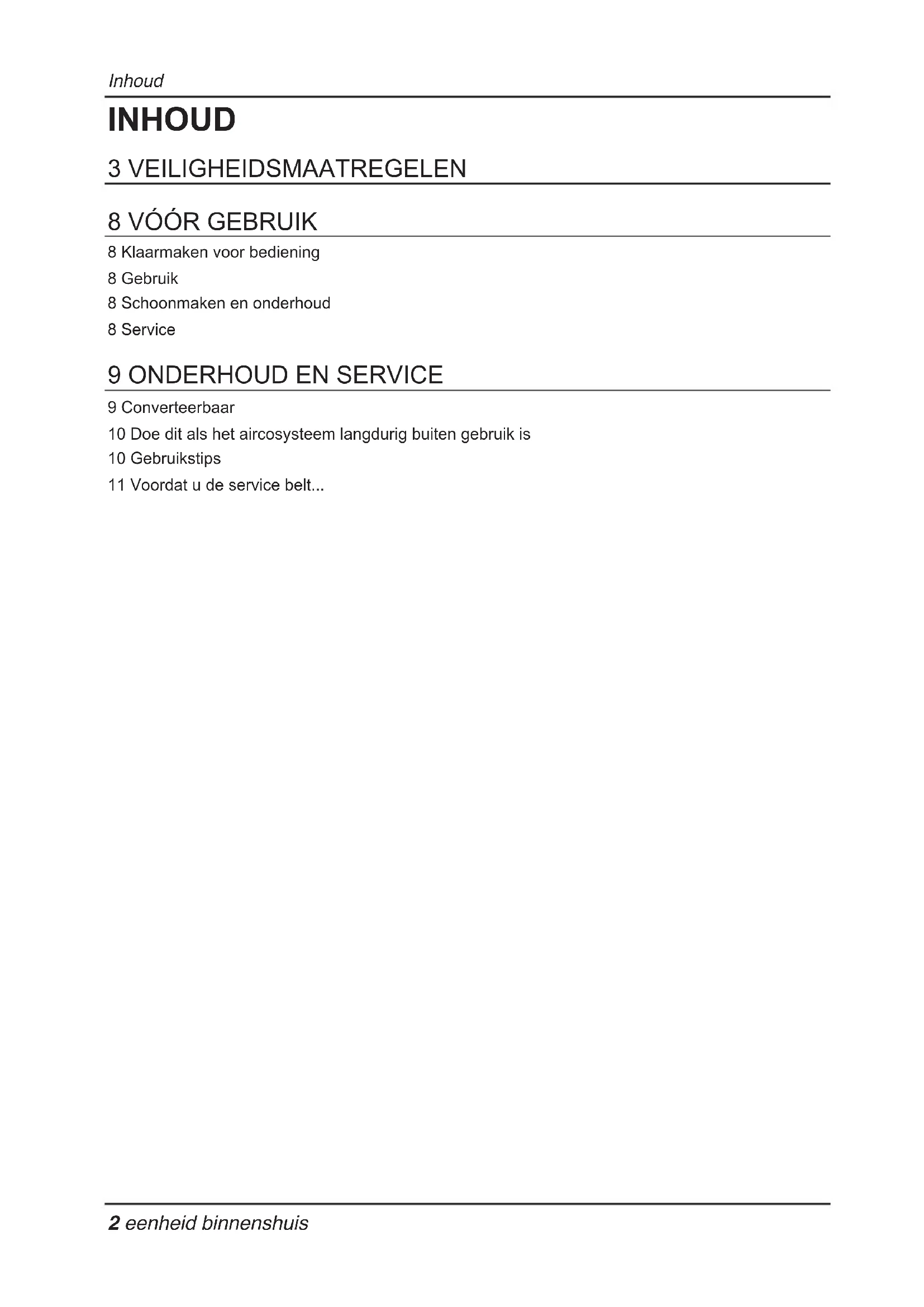 systeem reinigt. De ventilator draait met zeer hoge snelheid wanneer het systeem ingeschakeld is. U riskeert ernstige verwondingen als het aircosysteem tijdens het reinigen van de inwendige delen per abuis wordt ingeschakeld. Neem voor reparaties en onderhoud contact op met een officiële dealer of erkende servicecentrale. Service Vóór gebruik 8 eenheid binnenshuis Schoonmaken en onderhoud Gebruik Klaarmaken voor bediening Vóór gebruikConverteerbaar Rooster, behuizing en afstandsbediening Maak het hele systeem voordat reinigingswerkzaamheden worden uitgevoerd volledig stroomloos. Het systeem mag uitsluitend met een droge zachte doek worden gereinigd. Gebruik nooit blekende ofschurende reinigingsmiddelen.Voordat u het binnenelement reinigt, moet het hele aircosysteem stroomloos worden gemaakt. OPMERKING LUCHTFILTERS De luchtfilters achter het rooster aan de voorzijde moeten eenmaal per veertien dagen - of vaker als het nodigis - gecontroleerd en gereinigd worden.1. Til het toegangspaneel aan de voorzijde op en trek vervolgens het filterlipje enigszins naar voren om hetluchtfilter te verwijderen.2. U kunt het filter reinigen met een stofzuiger of een lauwwarm sopje.• Als het vuil hardnekkig is, was het filter dan in een lauwwarm sopje van een neutraal wasmiddel.• Om te voorkomen dat het filter vervormt, mag het water niet warmer zijn dan 40 °C.3. Nadat u het filter in ruim water hebt uitgespoeld, laat u het in de schaduw door en door drogen.4. Plaats het luchtfilter terug Gebruik nooit een van de volgende reinigingsmiddelen:• Water warmer dan 40 °C. Dit kan vervorming en/of verkleuring veroorzaken.• Vluchtige dampen kunnen het oppervlak van het aircosysteem beschadigen.