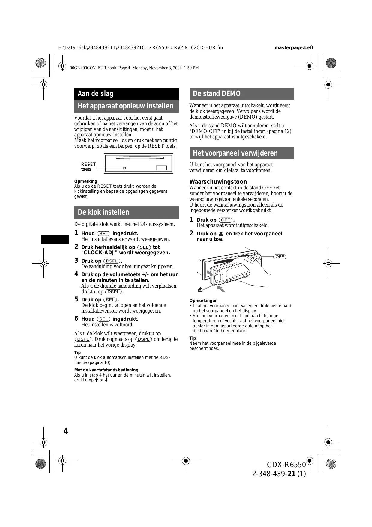 CDX-R6550 2-348-439-21 (1) H:\Data Disk\2348439211\234843921CDXR6550EUR\05NL02CD-EUR.fm masterpage:Left 00GB+00COV-EUR.book Page 4 Monday, November 8, 2004 1:50 PM Aan de slag Het apparaat opnieuw instellen Voordat u het apparaat voor het eerst gaat gebruiken of na het vervangen van de accu of het wijzigen van de aansluitingen, moet u het apparaat opnieuw instellen. Maak het voorpaneel los en druk met een puntig voorwerp, zoals een balpen, op de RESET toets. De stand DEMO Wanneer u het apparaat uitschakelt, wordt eerst de klok weergegeven. Vervolgens wordt de demonstratieweergave (DEMO) gestart. Als u de stand DEMO wilt annuleren, stelt u "DEMO-OFF" in bij de instellingen (pagina 12) terwijl het apparaat is uitgeschakeld. Het voorpaneel verwijderen RESET toets Opmerking Als u op de RESET toets drukt, worden de klokinstelling en bepaalde opgeslagen gegevens gewist. De klok instellen De digitale klok werkt met het 24-uurssysteem.