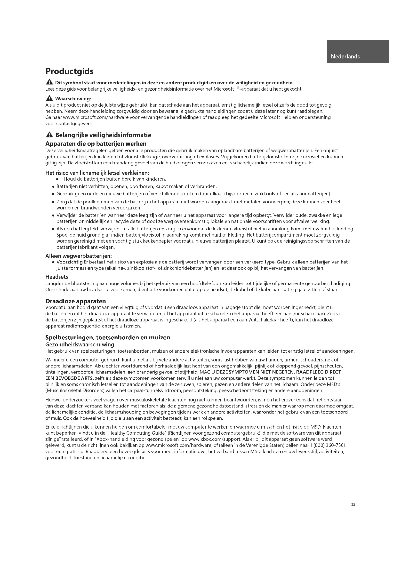 -apparaat dat u hebt gekocht. Waarschuwing: Als u dit product niet op de juiste wijze gebruikt, kan dat schade aan het apparaat, ernstig lichamelijk letsel of zelfs de dood tot gevolg hebben. Neem deze handleiding zorgvuldig door en bewaar alle gedrukte handleidingen zodat u deze later nog kunt raadplegen. Ga naar www.microsoft.com/hardware voor vervangende handleidingen of raadpleeg het gedeelte Microsoft Help en ondersteuning voor contactgegevens. Belangrijke veiligheidsinformatie Apparaten die op batterijen werken Deze veiligheidsmaatregelen gelden voor alle producten die gebruik maken van oplaadbare batterijen of wegwerpbatterijen. Een onjuist gebruik van batterijen kan leiden tot vloeistofl ekkage, oververhitting of explosies. Vrijgekomen batterijvloeistoffen zijn corrosief en kunnen giftig zijn. De vloeistof kan een branderig gevoel van de huid of ogen veroorzaken en is schadelijk indien deze wordt ingeslikt. Het risico van lichamelijk letsel verkleinen: ● Houd de batterijen buiten bereik van kinderen. ● Batterijen niet verhitten, openen, doorboren, kapot maken of verbranden. ● Gebruik geen oude en nieuwe batterijen of verschillende soorten door elkaar (bijvoorbeeld zinkkoolstof- en alkalinebatterijen). ● Zorg dat de poolklemmen van de batterij in het apparaat niet worden aangeraakt met metalen voorwerpen; deze kunnen zeer heet worden en brandwonden veroorzaken. ● Verwijder de batterijen wanneer deze leeg zijn of wanneer u het apparaat voor langere tijd opbergt. Verwijder oude, zwakke en lege batterijen onmiddellijk en recycle deze of gooi ze weg overeenkomstig lokale en nationale voorschriften voor afvalverwerking. ● Als een batterij lekt, verwijdert u alle batterijen en zorgt u ervoor dat de lekkende vloeistof niet in aanraking komt met uw huid of kleding. Spoel de huid grondig af indien batterijvloeistof in aanraking komt met huid of kleding. Het batterijcompartiment moet zorgvuldig worden gereinigd met een vochtig stuk keukenpapier voordat u nieuwe batterijen plaatst. U kunt ook de reinigingsvoorschriften van de batterijenfabrikant volgen. Alleen wegwerpbatterijen: ● Voorzichtig Er bestaat het risico van explosie als de batterij wordt vervangen door een verkeerd type. Gebruik alleen batterijen van het juiste formaat en type (alkaline-, zinkkoolstof-, of zinkchloridebatterijen) en let daar ook op bij het vervangen van batterijen. Headsets Langdurige blootstelling aan hoge volumes bij het gebruik van een hoofdtelefoon kan leiden tot tijdelijke of permanente gehoorbeschadiging. Om schade aan uw headset te voorkomen, dient u te voorkomen dat u op de headset, de kabel of de kabelaansluiting gaat zitten of staan. Draadloze apparaten Voordat u aan boord gaat van een vliegtuig of voordat u een draadloos apparaat in bagage stopt die moet worden ingecheckt, dient u de batterijen uit het draadloze apparaat te verwijderen of het apparaat uit te schakelen (het apparaat heeft een aan-/uitschakelaar). Zodra de batterijen zijn geplaatst of het draadloze apparaat is ingeschakeld (als het apparaat een aan-/uitschakelaar heeft), kan het draadloze apparaat radiofrequentie-energie uitstralen. Spelbesturingen, toetsenborden en muizen Gezondheidswaarschuwing Het gebruik van spelbesturingen, toetsenborden, muizen of andere elektronische invoerapparaten kan leiden tot ernstig letsel of aandoeningen. Wanneer u een computer gebruikt, kunt u, net als bij vele andere activiteiten, soms last hebben van uw handen, armen, schouders, nek of andere lichaamsdelen. Als u echter voortdurend of herhaaldelijk last hebt van een ongemakkelijk, pijnlijk of kloppend gevoel, pijnscheuten, tintelingen, verdoofde lichaamsdelen, een branderig gevoel of stijfheid, MAG U DEZE SYMPTOMEN NIET NEGEREN. RAADPLEEG DIRECT EEN BEVOEGDE ARTS, zelfs als deze symptomen voorkomen terwijl u niet aan uw computer werkt. Deze symptomen kunnen leiden tot pijnlijk en soms chronisch letsel en tot aandoeningen van de zenuwen, spieren, pezen en andere delen van het lichaam. Onder deze MSD’s (Musculoskeletal Disorders) vallen het carpaal-tunnelsyndroom, peesontsteking, peesschedeontsteking en andere aandoeningen. Hoewel onderzoekers veel vragen over musculoskeletale klachten nog niet kunnen beantwoorden, is men het erover eens dat het ontstaan van deze klachten verband kan houden met factoren als: de algemene gezondheidstoestand, stress en de manier waarop men daarmee omgaat, de lichamelijke conditie, de lichaamshouding en bewegingen tijdens werk en andere activiteiten, waaronder het gebruik van een toetsenbord of muis. Ook de hoeveelheid tijd die u aan een activiteit besteedt, kan een rol spelen. Enkele richtlijnen die u kunnen helpen om comfortabeler met uw computer te werken en waarmee u misschien het risico op MSD-klachten kunt beperken, vindt u in de “Healthy Computing Guide” (Richtlijnen voor gezond computergebruik), die met de software van dit apparaat zijn geïnstalleerd, of in “Xbox-handleiding voor gezond spelen” op www.xbox.com/support. Als er bij dit apparaat geen software werd geleverd, kunt u de richtlijnen ook bekijken op www.microsoft.com/hardware, of (alleen in de Verenigde Staten) bellen naar 1 (800) 360-7561 voor een gratis cd. Raadpleeg een bevoegde arts voor meer informatie over het verband tussen MSD-klachten en uw levensstijl, activiteiten, gezondheidstoestand en lichamelijke conditie. Nederlands23 Fotosensitieve epileptische aanvallen Een zeer klein percentage mensen loopt het risico op een epileptische aanval wanneer ze worden blootgesteld aan bepaalde beelden, zoals knipperende lichten of patronen die voorkomen in videogames. Ook personen die nooit last hebben gehad van epilepsie, kunnen een niet- gediagnosticeerde aandoening hebben waardoor er tijdens het bekijken van videogames een fotosensitieve epileptische aanval kan optreden. Deze aanvallen kunnen gepaard gaan met verschillende symptomen, zoals een licht gevoel in het hoofd, veranderd gezichtsvermogen, trillingen in het oog of gezicht, trekk