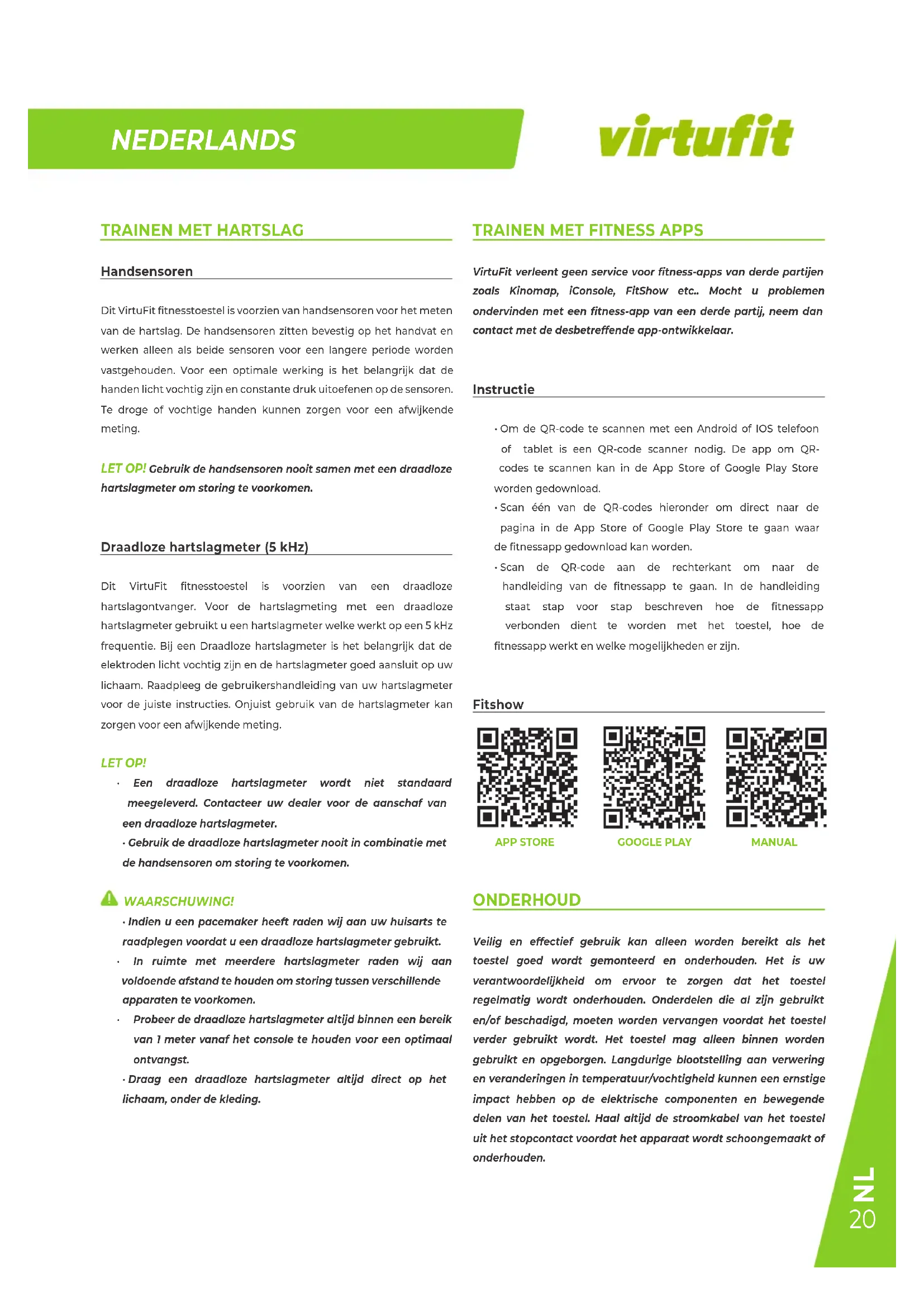 Trainen met hartslag 21 Trainen met fitness apps 21 Onderhoud 21 Insmeren van de loopband 22 Probleemoplossingen 23 Foutcodes 23 Console 23 Programma's 23 Trainingsrichtlijnen 24 VEILIGHEIDSINSTRUCTIES WAARSCHUWING! Raadpleeg uw arts voordat u begint met trainen. Dit is in het bijzonder belangrijk voor personen met gezondheidsproblemen. Lees alle instructies alvorens het toestel gebruikt wordt. VirtuFit neemt geen verantwoordelijkheid voor geleden letsel of materiële schade door het gebruik van dit toestel. Lees deze handleiding zorgvuldig door, voordat u begint met monteren van het toestel en/of er gebruik van gaat maken.