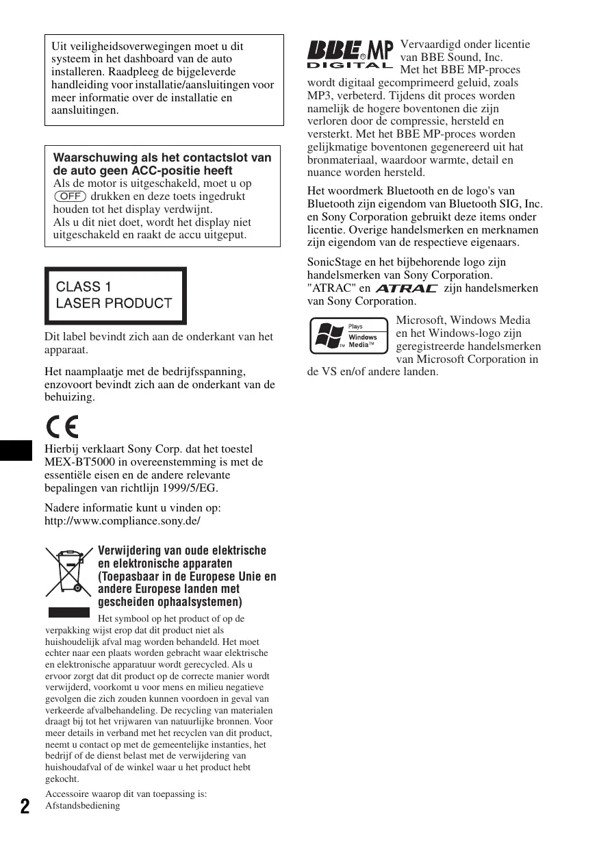 Hierbij verklaart Sony Corp. dat het toestel MEX-BT5000 in overeenstemming is met de essentiële eisen en de andere relevante bepalingen van richtlijn 1999/5/EG. Nadere informatie kunt u vinden op: http://www.compliance.sony.de/