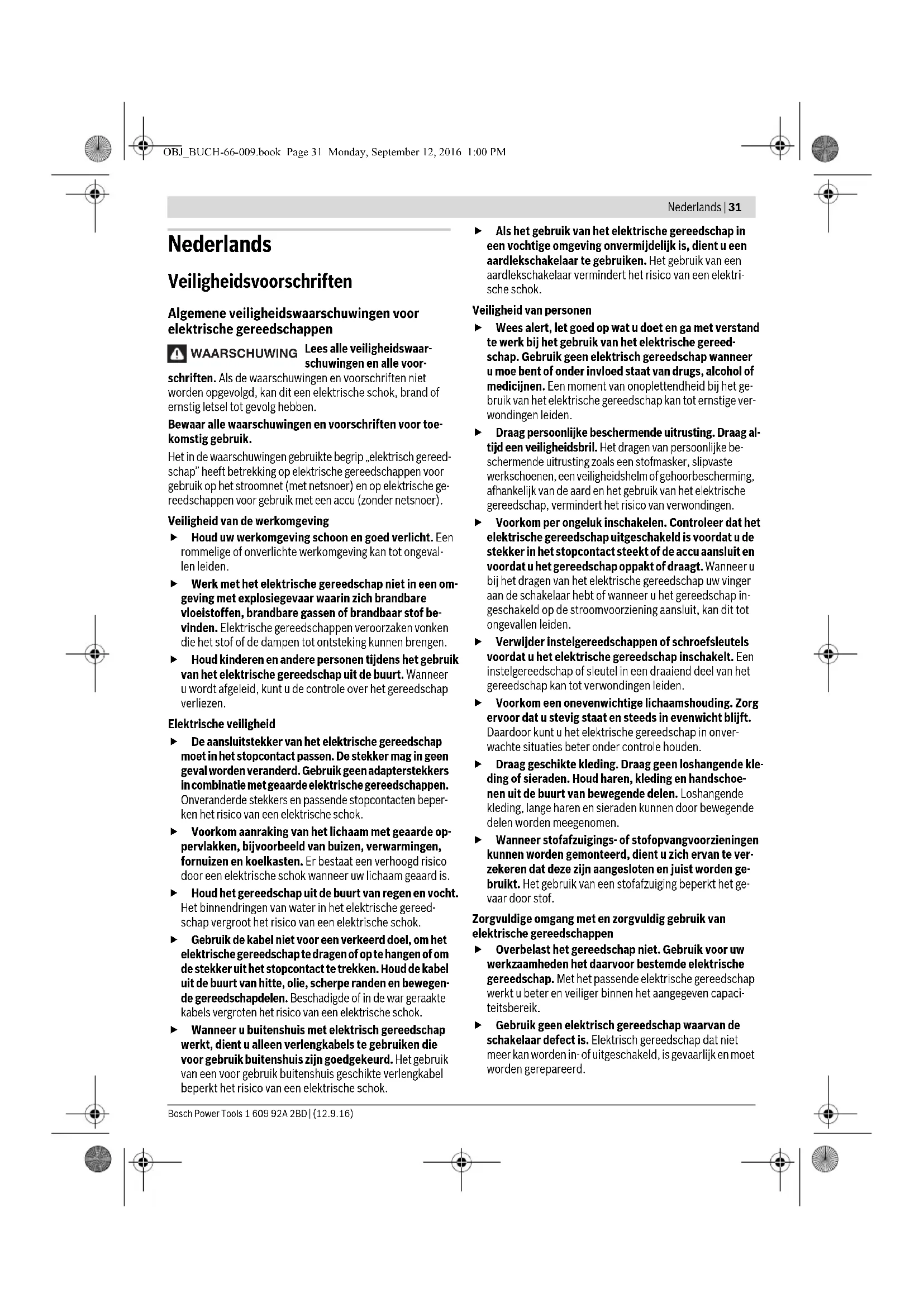 De gegevens gelden voor nominale spanningen [U] 230 V. Bij afwijken- de spanningen en bij per land verschillende uitvoeringen kunnen deze gegevens afwijken. OBJ_BUCH-66-009.book Page 32 Monday, September 12, 2016 1:00 PMNederlands | 33 Bosch Power Tools 1 609 92A 2BD | (12.9.16) Informatie over geluid en trillingen Geluidsemissiewaarden vastgesteld volgens EN 60745-2-6. Het A-gewogen geluidsniveau van het elektrische gereed- schap bedraagt kenmerkend: geluidsdrukniveau 89 dB(A); geluidsvermogenniveau 100 dB(A). Onzekerheid K=3 dB. Draag een gehoorbescherming. Totale trillingswaarden a