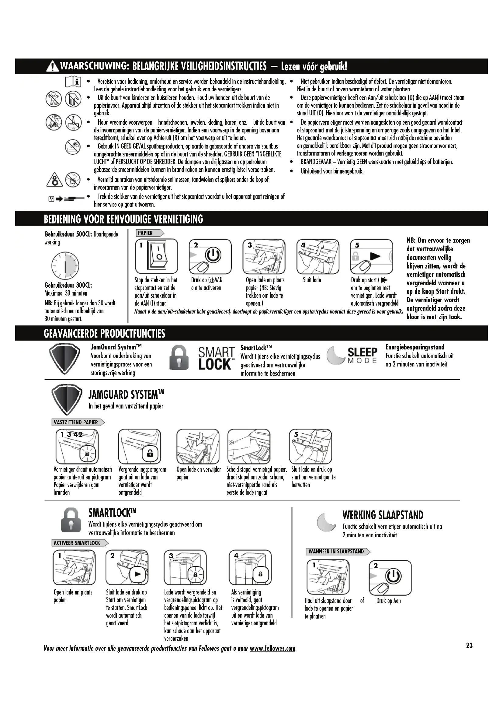 Voor meer informatie over alle geavanceerde productfuncties van Fellowes gaat u naar www.fellowes.com Nadat u de aan/uit-schakelaar hebt geactiveerd, doorloopt de papiervernietiger een opstartcyclus voordat deze gereed is voor gebruik. NB: Om ervoor te zorgen dat vertrouwelijke documenten veilig blijven zitten, wordt de vernietiger automatisch vergrendeld wanneer u op de knop Start drukt. De vernietiger wordt ontgrendeld zodra deze klaar is met zijn taak. Gebruiksduur 300CL: Maximaal 30 minuten NB:#JKHFCSVJLMBOHFSEBOøXPSEU BVUPNBUJTDIFFOBGLPFMUJKEWBO øNJOVUFOHFTUBSU Gebruiksduur 500CL: Doorlopende werking24 VERTRAAGDE START (ALLEEN OP 500CL)