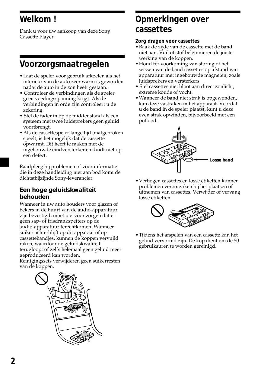 Welkom ! Dank u voor uw aankoop van deze Sony Cassette Player. Voorzorgsmaatregelen