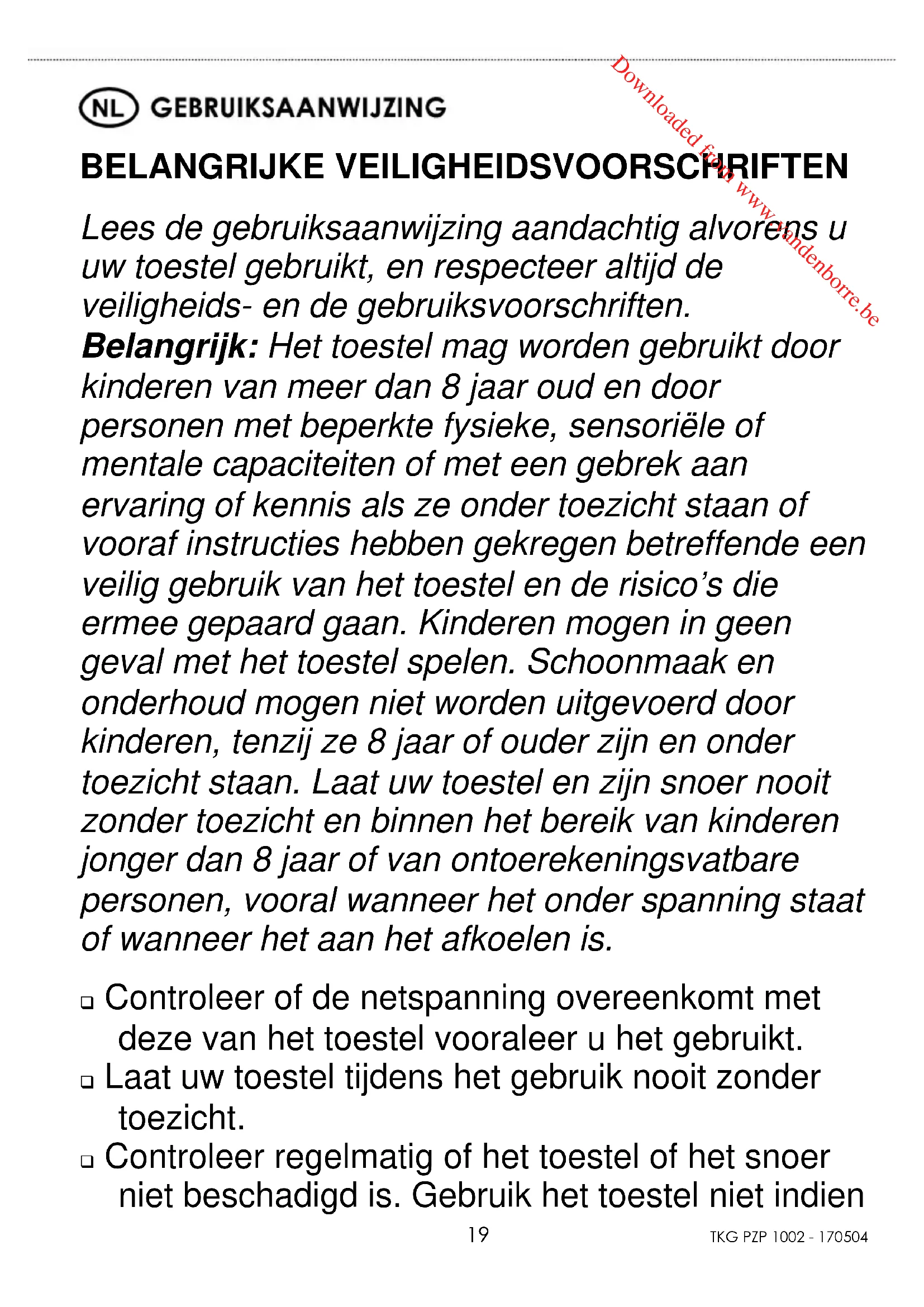 BELANGRIJKE VEILIGHEIDSVOORSCHRIFTEN Lees de gebruiksaanwijzing aandachtig alvorens u uw toestel gebruikt, en respecteer altijd de veiligheids- en de gebruiksvoorschriften. Belangrijk: Het toestel mag worden gebruikt door kinderen van meer dan 8 jaar oud en door personen met beperkte fysieke, sensoriële of mentale capaciteiten of met een gebrek aan ervaring of kennis als ze onder toezicht staan of vooraf instructies hebben gekregen betreffende een veilig gebruik van het toestel en de risico’s die ermee gepaard gaan. Kinderen mogen in geen geval met het toestel spelen. Schoonmaak en onderhoud mogen niet worden uitgevoerd door kinderen, tenzij ze 8 jaar of ouder zijn en onder toezicht staan. Laat uw toestel en zijn snoer nooit zonder toezicht en binnen het bereik van kinderen jonger dan 8 jaar of van ontoerekeningsvatbare personen, vooral wanneer het onder spanning staat of wanneer het aan het afkoelen is. Controleer of de netspanning overeenkomt met deze van het toestel vooraleer u het gebruikt. Laat uw toestel tijdens het gebruik nooit zonder toezicht. Controleer regelmatig of het toestel of het snoer niet beschadigd is. Gebruik het toestel niet indien Downloaded from www.vandenborre.beCopies of the I/B. Please reproduce them without any changes except under special instruction from Team International BELGIUM. The pages must be reproduced and folded in order to obtain a booklet A5 (+/- 148.5 mm width x 210 mm height). When folding, make sure you keep the good numbering when you turn the pages of the I/B. Don’t change the page numbering. Keep the language integrity.