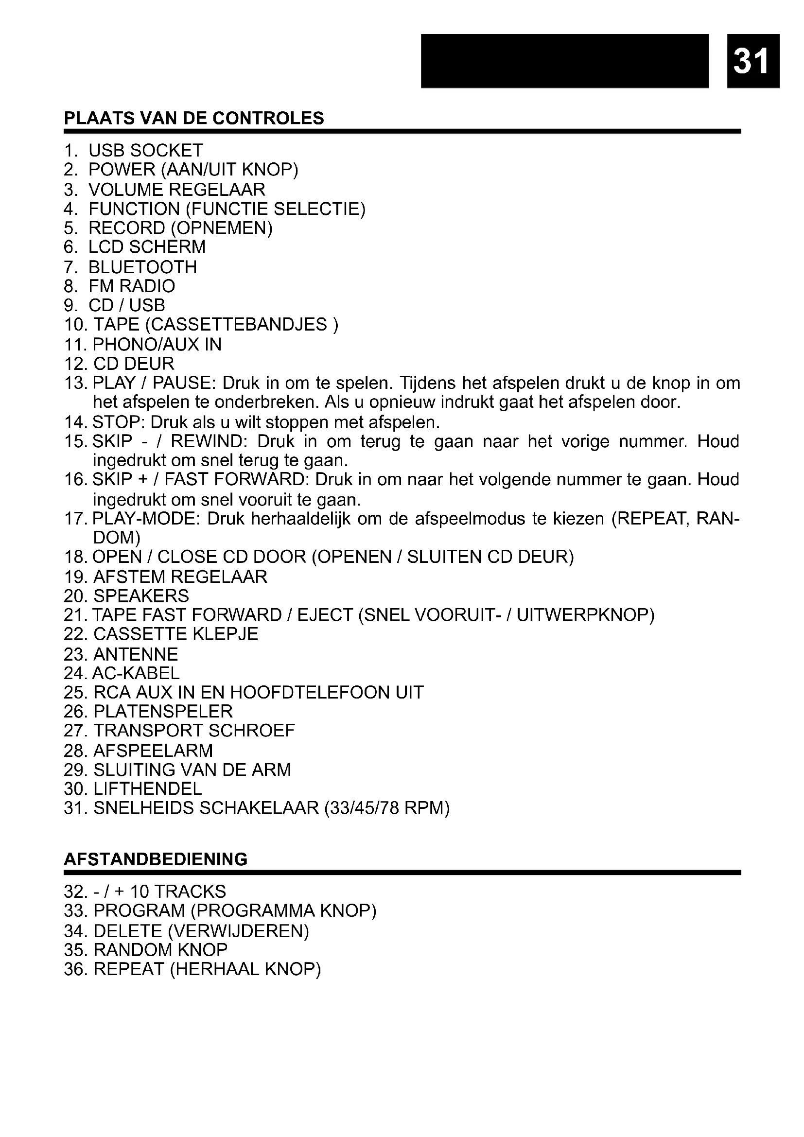 Druk op de [POWER] knop (2) om het apparaat in te schakelen. De LED-indicator (8) licht op; Selecteer de gewenste audiobron door op de knop [SOURCE] (7 tot 11) te drukken; (Zie gedetailleerde instructies voor elke bron in de volgende hoofdstukken); Stel de [VOLUME KNOP] (3) in op het gewenste niveau; Om de radio uit te schakelen, drukt u op [POWER] knop (2) en houdt u deze ingedrukt.33 Nederlands Let op: Als er geen geluid wordt geproduceerd schakelt het apparaat zelfs uit na 10 minuten. BEDIENING RADIO Druk op de knop [FM] (8); Met de [TUNING KNOP] (19) stelt u de radiofrequentie in op de gewenste zender. Let op: Voor een betere ontvangst, verandert u de richting waarnaar de antenne (23) wijst. PLATENSPELER Let op: Wanneer u de draaitafel voor de eerste keer gebruikt, draai met de klok mee de [TRANSPORT-SCHROEF] (27) die zich rechtsboven aan de draaitafel bevindt los. Druk op de knop [PHONO] (11); Plaats een plaat op in het midden van de platenspeler. Bij het beluistern van 45 toeren plaats de EP-adapter op de centrale spil; Stel de [SNELHEIDS SCHAKELAAR] (31) af op 33/45 of op 78 toeren, in overeen- komst met de plaat die wordt afgespeeld; Geef de [SLUITING VAN DE ARM] (29) vrij en verwijder de beschermkap van de naald; Hef de [AFSPEELARM] (28) op met de [LIFTHENDEL] (30); Plaats de [AFSPEELARM] (28) aan het begin van de plaat of aan het begin van een bepaalde track; Laat de [AFSPEELARM] (28) uiterst voorzichtig op de plaat zakken met de [LIFTHENDEL] (30) om te beginnen met het afspelen; Als de plaat het einde heeft bereikt, zal de [PLATENSPELER] (26) automatisch stop- pen en de [AFSPEELARM] (28) keert terug naar de steun. Om de [PLATENSPELER] (26) te stoppen tijdens het afspelen, dient de [AFSPEELARM] (28) te worden opgeheven en op de steun te worden geplaatst. Opmerking: De [PLATENSPELER] (26) niet handmatig draaien. Wanneer het apparaat wordt verplaatst of vervoerd: Vergrendel [AFSPEELARM] (28) met de [SLUITING VAN DE ARM] (29). Plaats de beschermkap van de naald (ook wanneer deze niet in gebruik is). Schroef de [TRANSPORT-SCHROEF] (27) tegen de klok in totdat u weerstand voelt (niet helemaal schroeven).