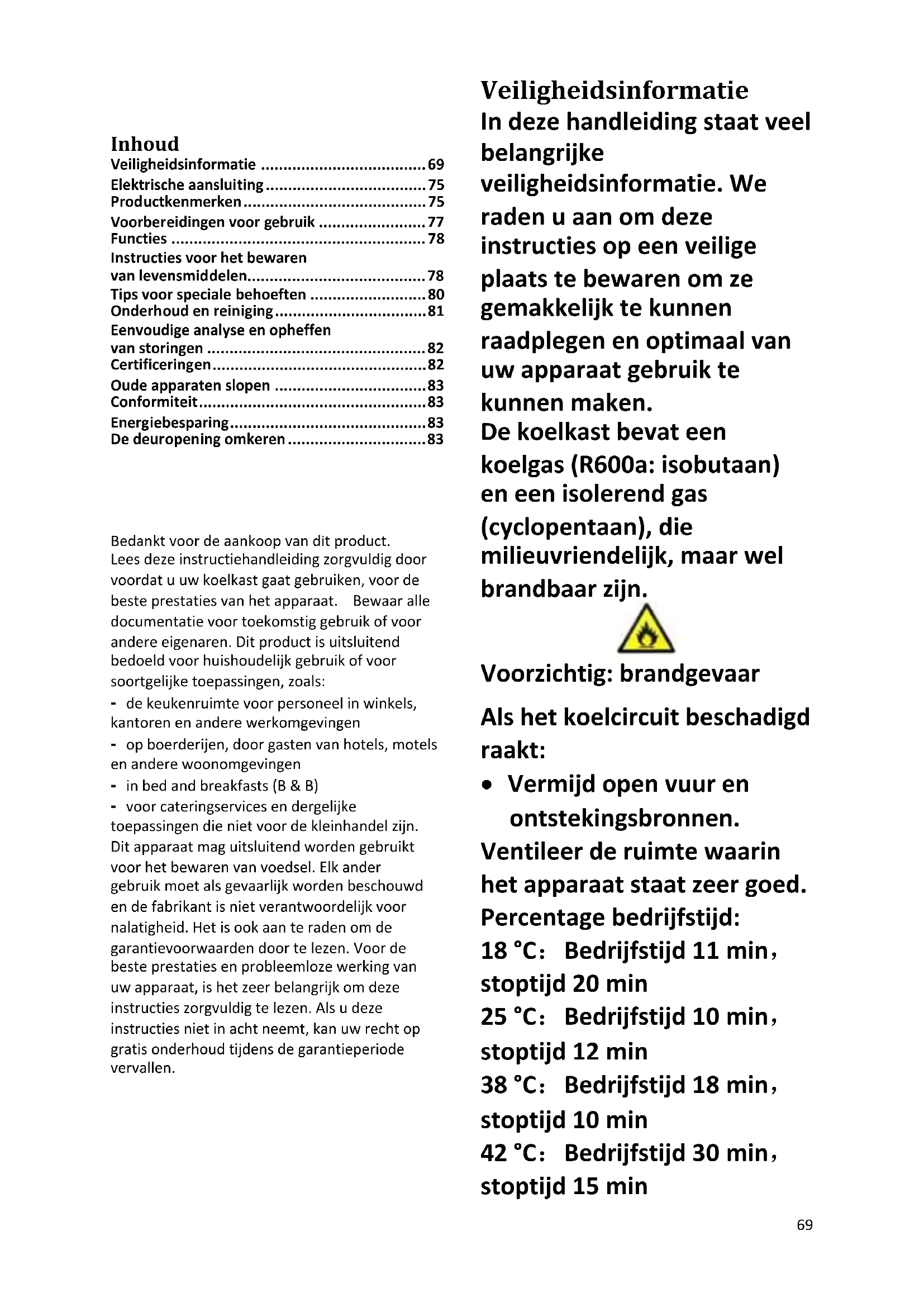 Bedankt voor de aankoop van dit product. Lees deze instructiehandleiding zorgvuldig door voordat u uw koelkast gaat gebruiken, voor de beste prestaties van het apparaat. Bewaar alle documentatie voor toekomstig gebruik of voor andere eigenaren. Dit product is uitsluitend bedoeld voor huishoudelijk gebruik of voor soortgelijke toepassingen, zoals: - de keukenruimte voor personeel in winkels, kantoren en andere werkomgevingen - op boerderijen, door gasten van hotels, motels en andere woonomgevingen - in bed and breakfasts (B & B) - voor cateringservices en dergelijke toepassingen die niet voor de kleinhandel zijn. Dit apparaat mag uitsluitend worden gebruikt voor het bewaren van voedsel. Elk ander gebruik moet als gevaarlijk worden beschouwd en de fabrikant is niet verantwoordelijk voor nalatigheid. Het is ook aan te raden om de garantievoorwaarden door te lezen. Voor de beste prestaties en probleemloze werking van uw apparaat, is het zeer belangrijk om deze instructies zorgvuldig te lezen. Als u deze instructies niet in acht neemt, kan uw recht op gratis onderhoud tijdens de garantieperiode vervallen. Veiligheidsinformatie In deze handleiding staat veel belangrijke veiligheidsinformatie. We raden u aan om deze instructies op een veilige plaats te bewaren om ze gemakkelijk te kunnen raadplegen en optimaal van uw apparaat gebruik te kunnen maken. De koelkast bevat een koelgas (R600a: isobutaan) en een isolerend gas (cyclopentaan), die milieuvriendelijk, maar wel brandbaar zijn. Voorzichtig: brandgevaar Als het koelcircuit beschadigd raakt: