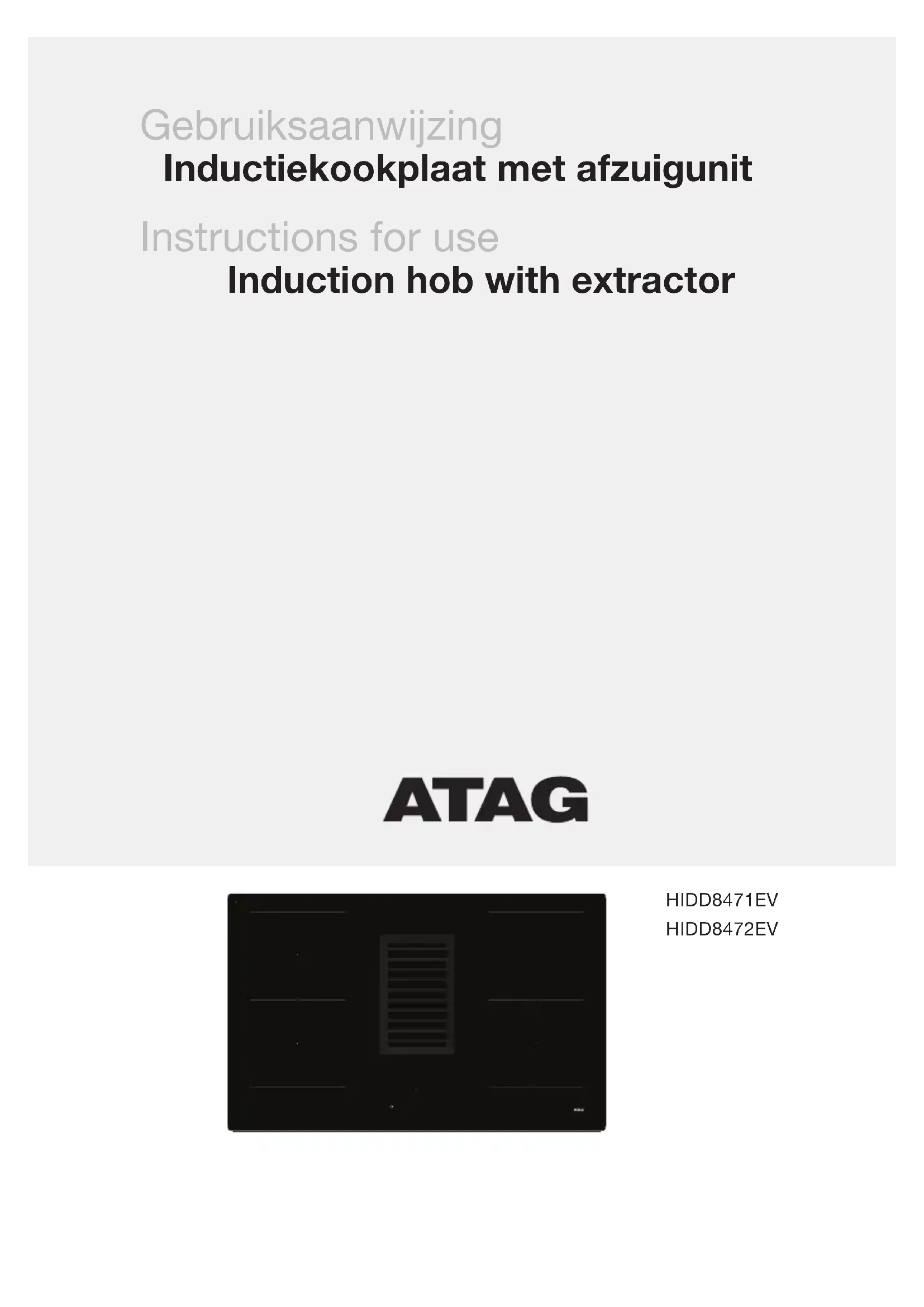 Gebruiksaanwijzing Inductiekookplaat met afzuigunit Instructions for use Induction hob with extractor HIDD8471EV HIDD8472EVNL 2 Uw inductiekookplaat Inleiding 4 Beschrijving 5 Bedieningspaneel 6 Meldingen op het display 7 Veiligheid Temperatuurbeveiliging 8 Kookduurbegrenzer 8 Voor het eerste gebruik Gebruik van de aanraaktoetsen en de schuifregelaar 9 Inductiegeluiden 9 Geschikte pannen 9 Pandetectie 10 Vermogensniveaus 10 Richtlijnen voor het koken 11 Gebruik van de afzuigunit 12 Bediening van de kookplaat Bereiding starten 13 Boost 14 Pandetectiesymbool 14 Klaar met koken 15 De automatische opwarmfunctie inschakelen 15 De warmhoudfunctie inschakelen 16 De Bridge-inductiekookzones koppelen 16 Koken pauzeren 17 De eierwekker gebruiken 18 De timer gebruiken 19 Herstelfunctie 20 Kinderslot 20 Vergrendelingsfunctie voor een snelle reiniging 21 Bediening van de afzuigunit De automatische afzuigmodus uitschakelen 22 De automatische afzuigmodus uitschakelen tijdens het koken 22 Handmatig de afzuigunit inschakelen 23 INHOUDSOPGAVENL 3 INHOUDSOPGAVE Boost 23 Instellen van 15 minuten vertragingstijd 24 Verzadiging van het vetfilter 24 Verzadiging van het geurfilter 25 Geheugenreset van de indicatie van de filterverzadiging 25 Gebruikersmenu 26 Vermogensbegrenzer 27 Onderhoud Reiniging 29 Waterreservoir 29 Filters reinigen 30 Problemen oplossen 31 Technische specificaties Technische gegevens 33 Informatie volgens verordening (EU) 66/2014 33 Milieuaspecten Verpakking en apparaat afdanken 34 Gebruikte pictogrammen Belangrijke informatie Handig om te weten Elektrische aansluitingNL 4 Inleiding Gefeliciteerd met uw keuze voor dit toestel van Atag. In het ontwerp van dit product heeft eenvoudige bediening en optimale gebruiksvriendelijkheid centraal gestaan. In deze handleiding leest u hoe u dit toestel het best kunt gebruiken. Naast informatie over de bediening, vindt u hier ook achtergrondinformatie die u tijdens het gebruik van het toestel van pas kan komen. Lees eerst de separate veiligheidsinstructies voordat u het toestel gebruikt. Lees deze handleiding door voordat u het toestel in gebruik neemt, en berg de handleiding daarna veilig op voor toekomstig gebruik. Deze handleiding dient als referentie voor de servicedienst. Plak het typeplaatje in het daarvoor bestemde kader, achter op de handleiding. Het typeplaatje bevat alle informatie die de servicedienst nodig heeft om adequaat op uw vragen te reageren. Op onze website kunt u de meest recente versie van de gebruiksaanwijzing vinden. UW INDUCTIEKOOKPLAATNL 5 Beschrijving