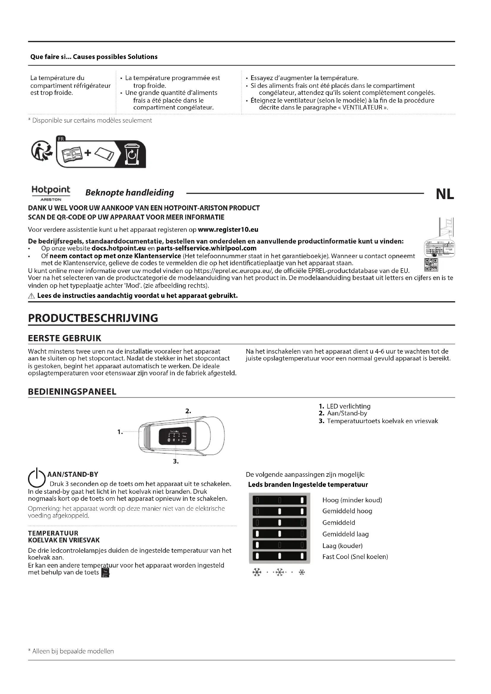 Beknopte handleiding DANK U WEL VOOR UW AANKOOP VAN EEN HOTPOINT-ARISTON PRODUCT SCAN DE QR-CODE OP UW APPARAAT VOOR MEER INFORMATIE Voor verdere assistentie kunt u het apparaat registeren op www . register10.eu De bedrijfsregels, standaarddocumentatie, bestellen van onderdelen en aanvullende productinformatie kunt u vinden: