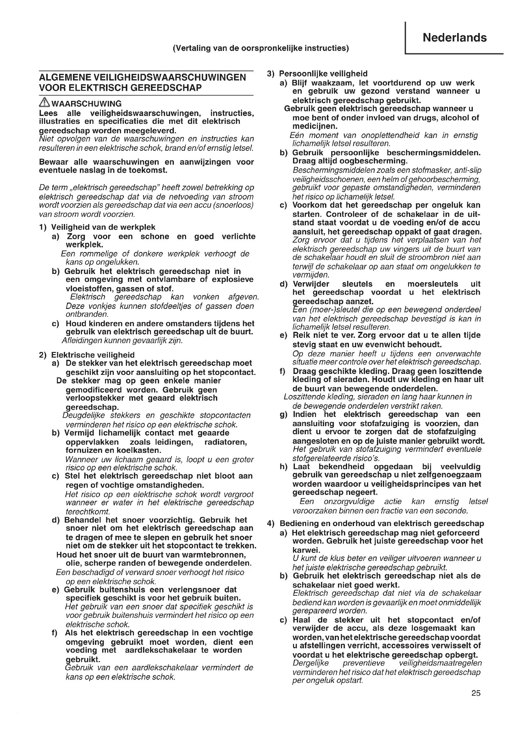a) Zorg voor een schone en goed verlichte werkplek. Een rommelige of donkere werkplek verhoogt de kans op ongelukken. b) Gebruik het elektrisch gereedschap niet in een omgeving met ontvlambare of explosieve vloeistoen, gassen of stof. Elektrisch gereedschap kan vonken afgeven. Deze vonkjes kunnen stofdeeltjes of gassen doen ontbranden.