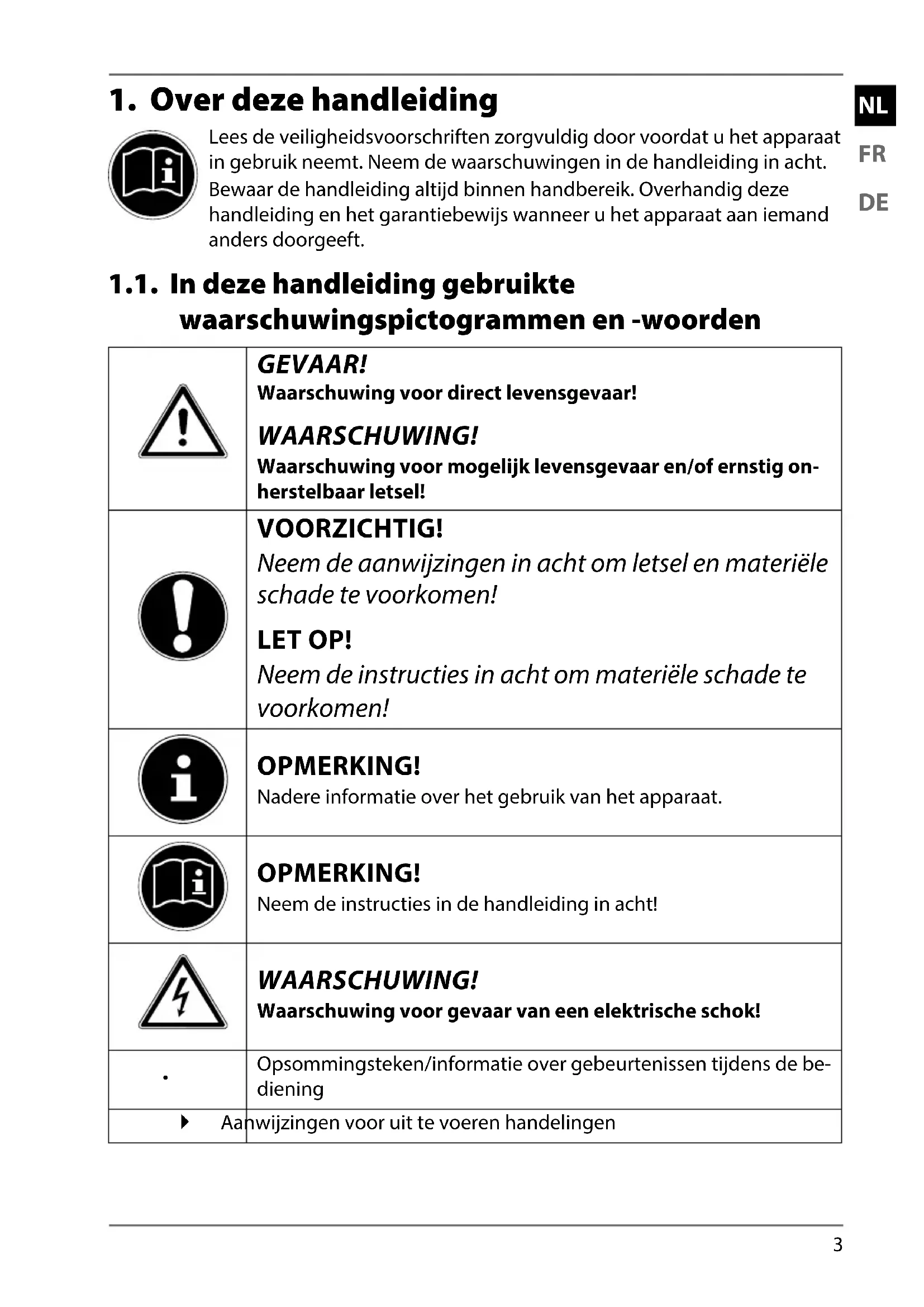 Lees de veiligheidsvoorschriften zorgvuldig door voordat u het apparaat in gebruik neemt. Neem de waarschuwingen in de handleiding in acht. Bewaar de handleiding altijd binnen handbereik. Overhandig deze handleiding en het garantiebewijs wanneer u het apparaat aan iemand anders doorgeeft. 1.1. In deze handleiding gebruikte waarschuwingspictogrammen en -woorden GEVAAR! Waarschuwing voor direct levensgevaar! WAARSCHUWING! Waarschuwing voor mogelijk levensgevaar en/of ernstig on- herstelbaar letsel! VOORZICHTIG! Neem de aanwijzingen in acht om letsel en materiële schade te voorkomen! LET OP! Neem de instructies in acht om materiële schade te voorkomen! OPMERKING! Nadere informatie over het gebruik van het apparaat. OPMERKING! Neem de instructies in de handleiding in acht! WAARSCHUWING! Waarschuwing voor gevaar van een elektrische schok!