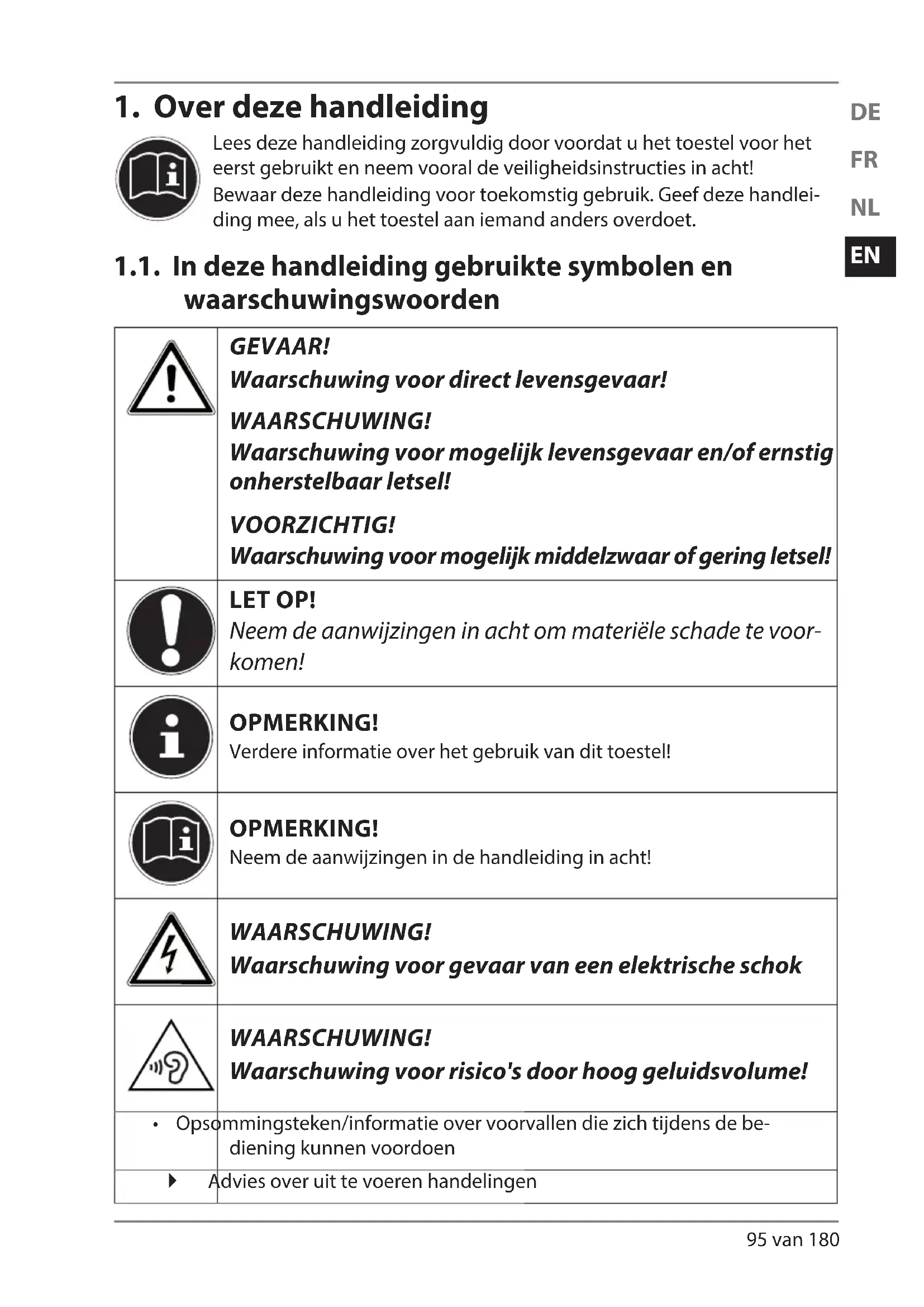 Lees deze handleiding zorgvuldig door voordat u het toestel voor het eerst gebruikt en neem vooral de veiligheidsinstructies in acht! Bewaar deze handleiding voor toekomstig gebruik. Geef deze handlei- ding mee, als u het toestel aan iemand anders overdoet. 1.1. In deze handleiding gebruikte symbolen en waarschuwingswoorden GEVAAR! Waarschuwing voor direct levensgevaar! WAARSCHUWING! Waarschuwing voor mogelijk levensgevaar en/of ernstig onherstelbaar letsel! VOORZICHTIG! Waarschuwing voor mogelijk middelzwaar of gering letsel! LET OP! Neem de aanwijzingen in acht om materiële schade te voor- komen! OPMERKING! Verdere informatie over het gebruik van dit toestel! OPMERKING! Neem de aanwijzingen in de handleiding in acht! WAARSCHUWING! Waarschuwing voor gevaar van een elektrische schok WAARSCHUWING! Waarschuwing voor risico's door hoog geluidsvolume!