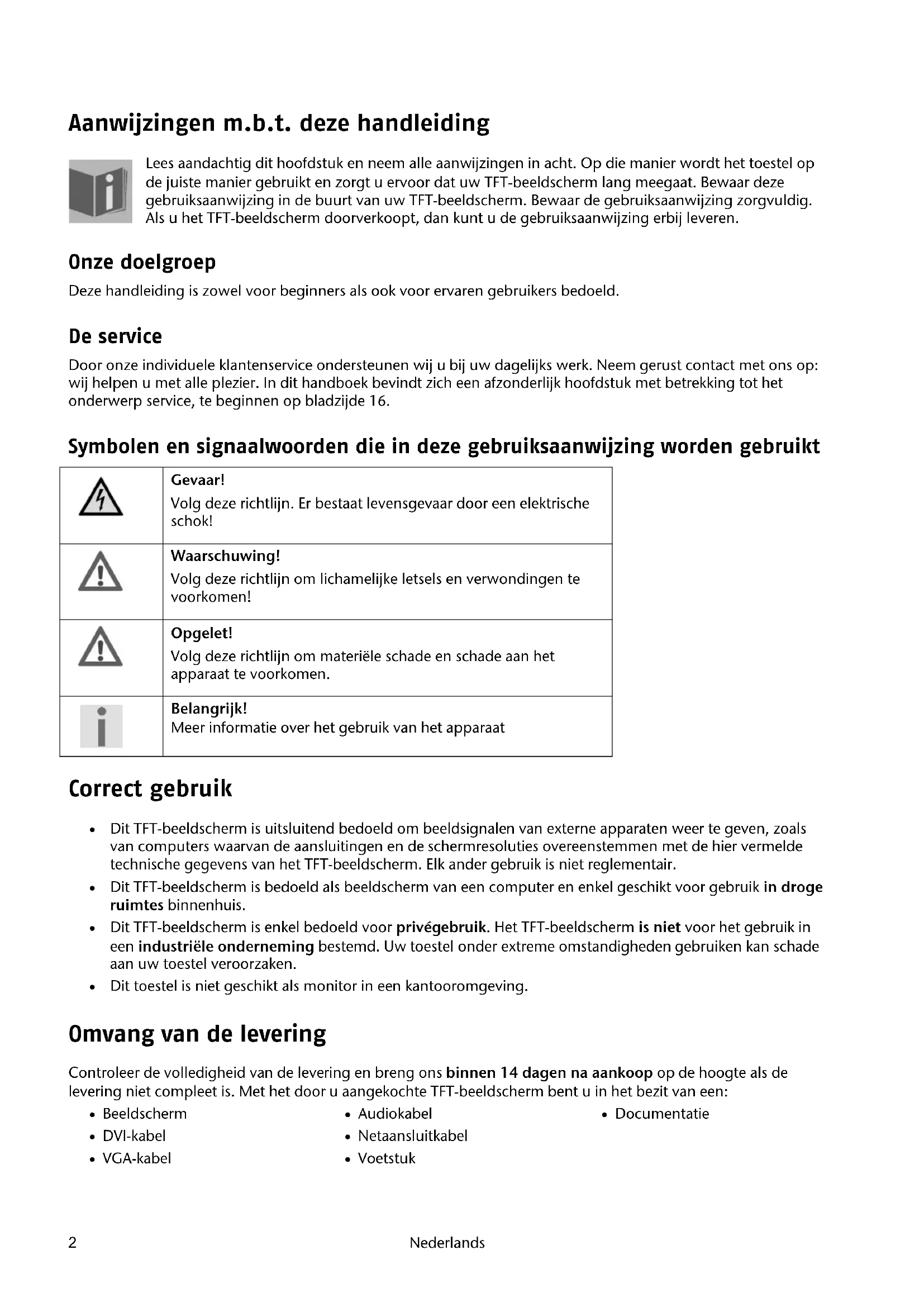 Aanwijzingen m.b.t. deze handleiding Lees aandachtig dit hoofdstuk en neem alle aanwijzingen in acht. Op die manier wordt het toestel op de juiste manier gebruikt en zorgt u ervoor dat uw TFT-beeldscherm lang meegaat. Bewaar deze gebruiksaanwijzing in de buurt van uw TFT-beeldscherm. Bewaar de gebruiksaanwijzing zorgvuldig. Als u het TFT-beeldscherm doorverkoopt, dan kunt u de gebruiksaanwijzing erbij leveren. Onze doelgroep Deze handleiding is zowel voor beginners als ook voor ervaren gebruikers bedoeld. De service Door onze individuele klantenservice ondersteunen wij u bij uw dagelijks werk. Neem gerust contact met ons op: wij helpen u met alle plezier. In dit handboek bevindt zich een afzonderlijk hoofdstuk met betrekking tot het onderwerp service, te beginnen op bladzijde 16. Symbolen en signaalwoorden die in deze gebruiksaanwijzing worden gebruikt Gevaar! Volg deze richtlijn. Er bestaat levensgevaar door een elektrische schok! Waarschuwing! Volg deze richtlijn om lichamelijke letsels en verwondingen te voorkomen! Opgelet! Volg deze richtlijn om materiële schade en schade aan het apparaat te voorkomen. Belangrijk! Meer informatie over het gebruik van het apparaat Correct gebruik Dit TFT-beeldscherm is uitsluitend bedoeld om beeldsignalen van externe apparaten weer te geven, zoals van computers waarvan de aansluitingen en de schermresoluties overeenstemmen met de hier vermelde technische gegevens van het TFT-beeldscherm. Elk ander gebruik is niet reglementair. Dit TFT-beeldscherm is bedoeld als beeldscherm van een computer en enkel geschikt voor gebruik in droge ruimtes binnenhuis. Dit TFT-beeldscherm is enkel bedoeld voor privégebruik. Het TFT-beeldscherm is niet voor het gebruik in een industriële onderneming bestemd. Uw toestel onder extreme omstandigheden gebruiken kan schade aan uw toestel veroorzaken. Dit toestel is niet geschikt als monitor in een kantooromgeving. Omvang van de levering Controleer de volledigheid van de levering en breng ons binnen 14 dagen na aankoop op de hoogte als de levering niet compleet is. Met het door u aangekochte TFT-beeldscherm bent u in het bezit van een: Beeldscherm DVI-kabel VGA-kabel Audiokabel Netaansluitkabel Voetstuk DocumentatieVeiligheidsadviezen