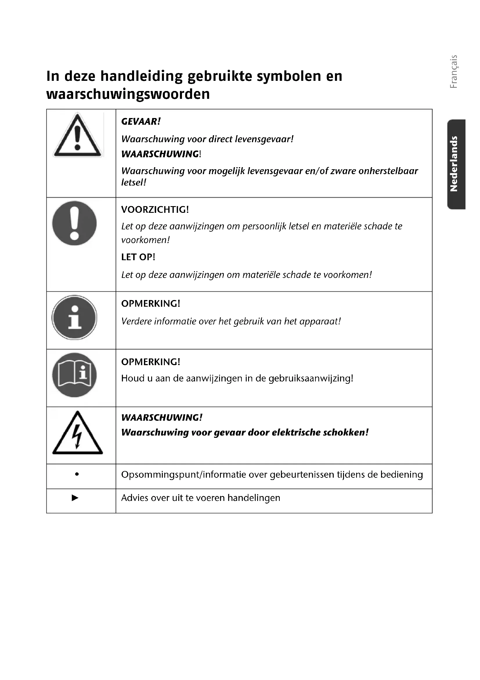 Utilisation de l'accu ............................ 10 UUID .................................................. 27Nederlands Français In deze handleiding gebruikte symbolen en waarschuwingswoorden GEVAAR! Waarschuwing voor direct levensgevaar! WAARSCHUWING! Waarschuwing voor mogelijk levensgevaar en/of zware onherstelbaar letsel! VOORZICHTIG! Let op deze aanwijzingen om persoonlijk letsel en materiële schade te voorkomen! LET OP! Let op deze aanwijzingen om materiële schade te voorkomen! OPMERKING! Verdere informatie over het gebruik van het apparaat! OPMERKING! Houd u aan de aanwijzingen in de gebruiksaanwijzing! WAARSCHUWING! Waarschuwing voor gevaar door elektrische schokken!
