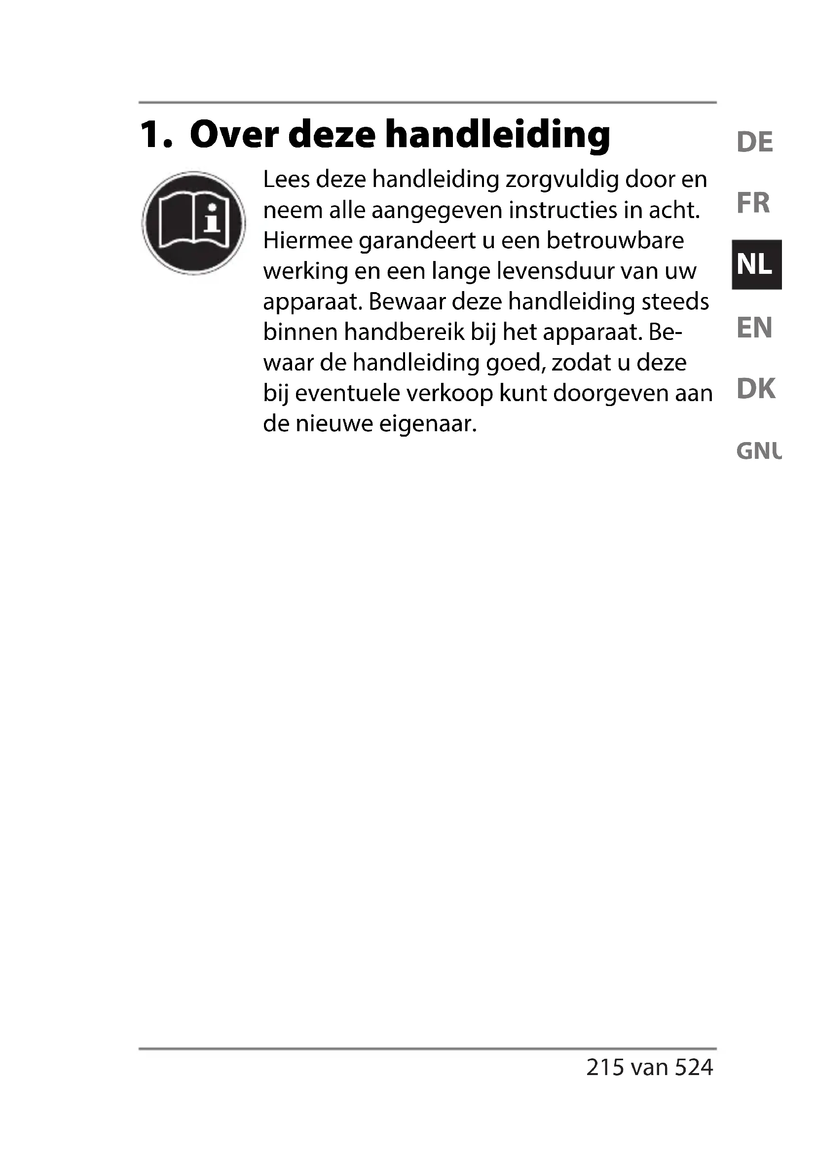 Lees deze handleiding zorgvuldig door en neem alle aangegeven instructies in acht. Hiermee garandeert u een betrouwbare werking en een lange levensduur van uw apparaat. Bewaar deze handleiding steeds binnen handbereik bij het apparaat. Be- waar de handleiding goed, zodat u deze bij eventuele verkoop kunt doorgeven aan de nieuwe eigenaar. Ecom ML final REV2.indb 215Ecom ML final REV2.indb 215 07.03.2016 10:21:4107.03.2016 10:21:41216 van 524 1.1. In deze handleiding gebruikte waarschuwingssymbolen en -woorden GEVAAR! Waarschuwing voor acuut le- vensgevaar! WAARSCHUWING! Waarschuwing voor mogelijk levensgevaar en/of ernstig on- herstelbaar letsel! VOORZICHTIG! Waarschuwing voor mogelijk middelzwaar of gering letsel! LET OP! Neem de aanwijzingen in acht om materiële schade te voorko- men! LET OP! Aanvullende informatie over het gebruik van dit apparaat! Ecom ML final REV2.indb 216Ecom ML final REV2.indb 216 07.03.2016 10:21:4107.03.2016 10:21:41217 van 524